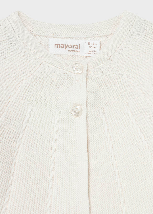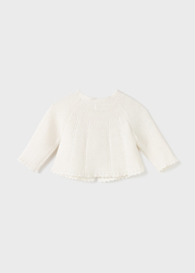 ECOFRIENDS-Kleidungsstück aus 100 % Bio-Baumwolle. Langärmlige Strickjacke für Mädchen von 0-18 Monaten. Rundhalsausschnitt. Modell aus unserer Basic-Kollektion im klassischen Design, ideal kombinierbar mit jedem Outfit. Kreuzverschluss mit Knopfleiste vorne.
