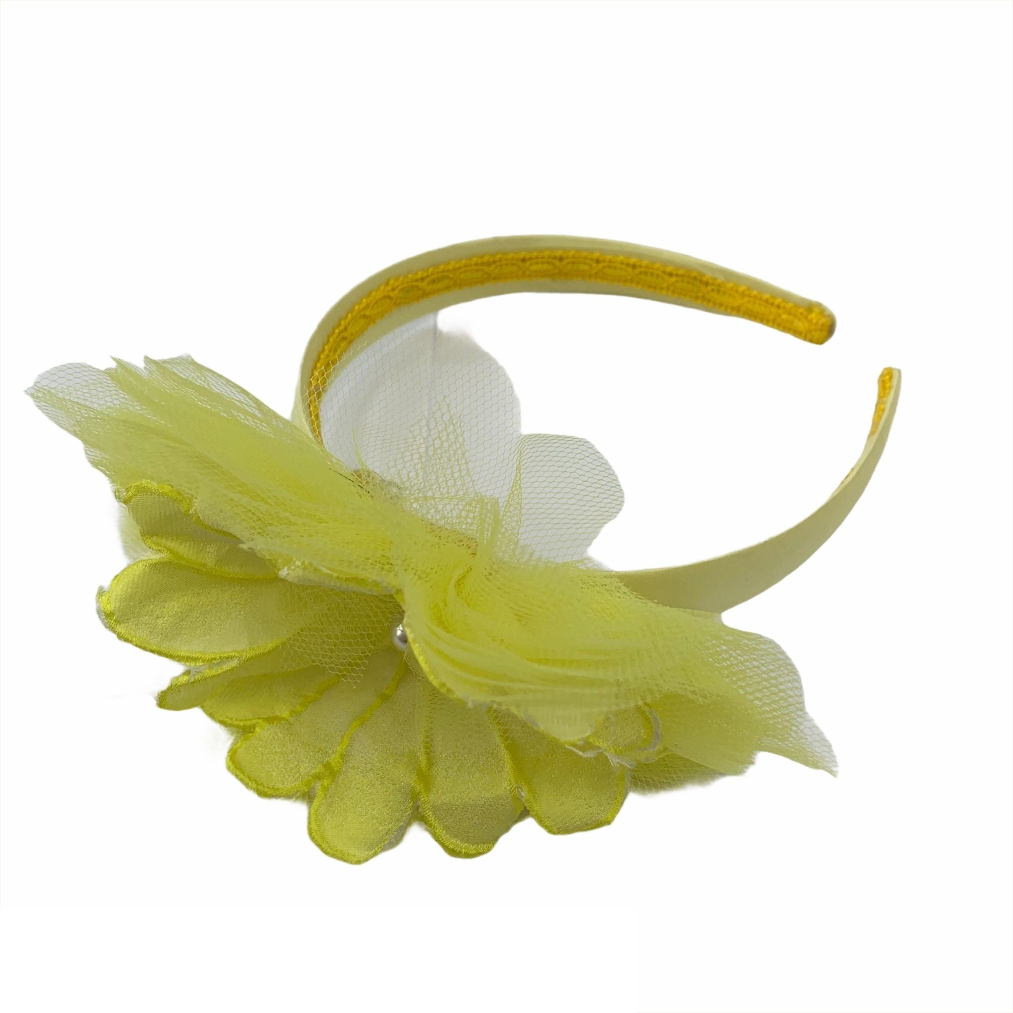 Gelbes Satin-Stirnband mit Tüll- und Perlenblumenapplikation.