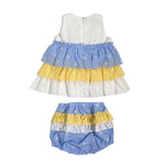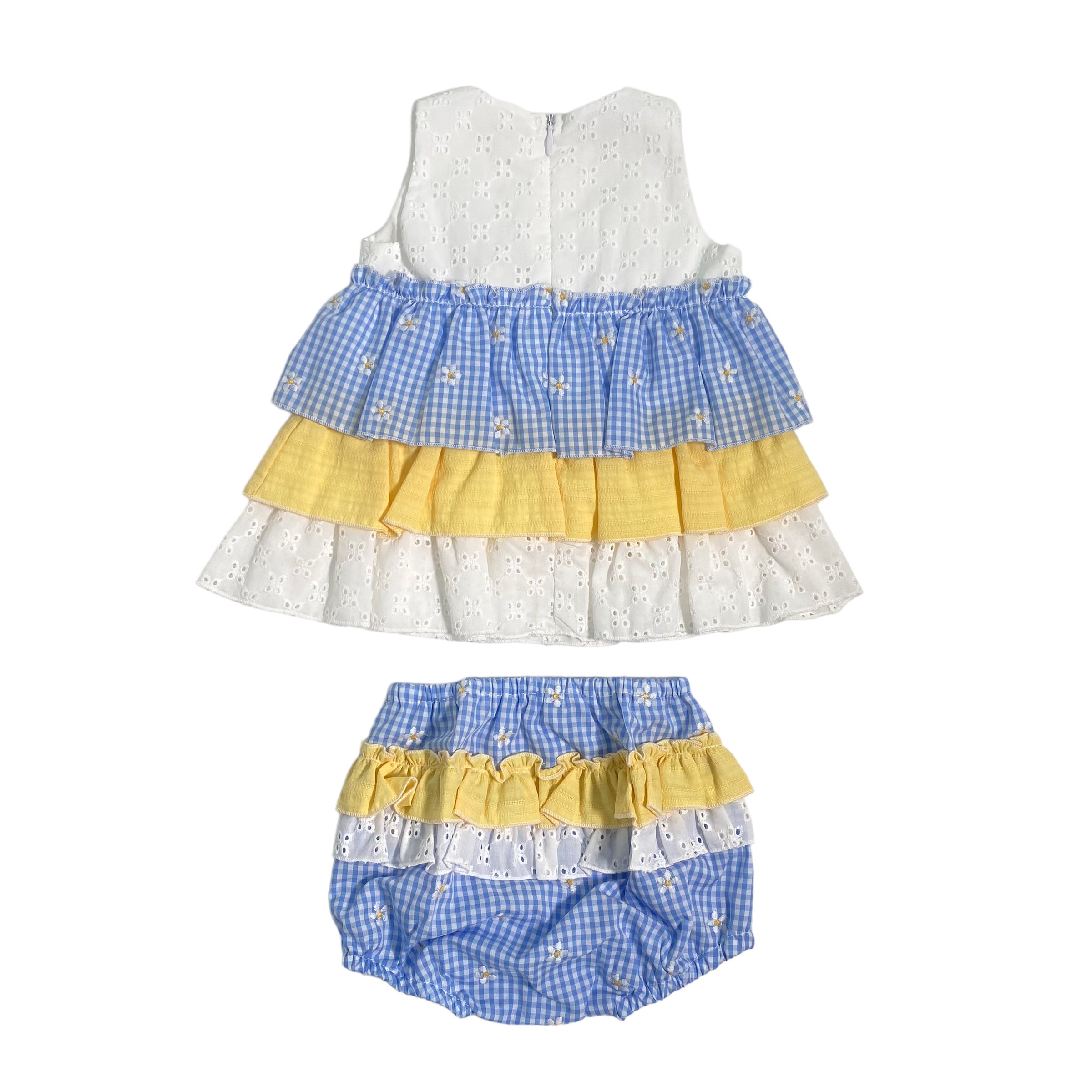 Bluse mit Armausschnitt, verziert mit Volants in verschiedenen Farben. gelb, bluette und mit Gänseblümchenstickerei verziert. Drei schöne Blumen an der Taille leicht zur Seite verschoben.