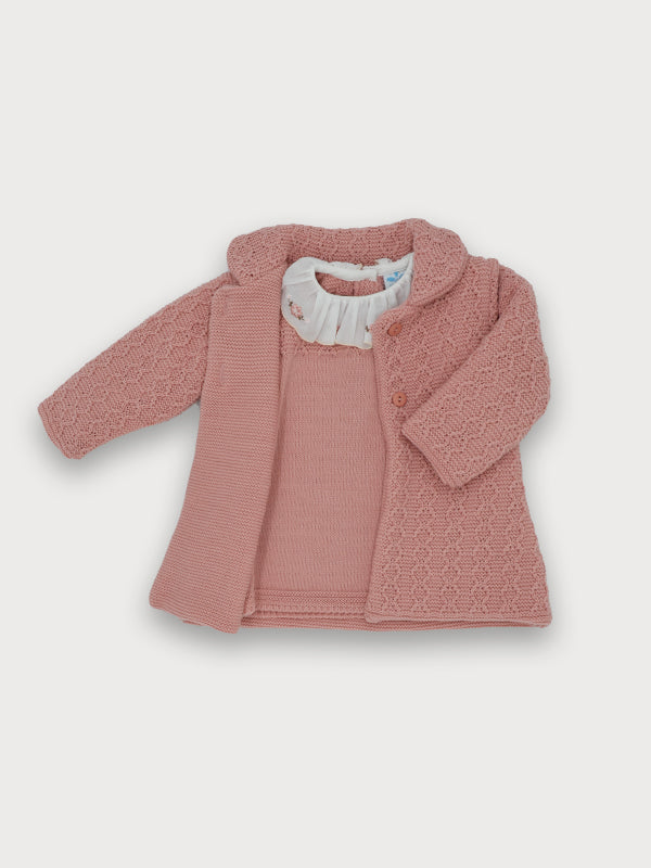 Questo completo per neonata è perfetto per un'occasione speciale grazie alla sua eleganza e alla moda. Realizzato in tessuto anallergico acrilico, l'abito presenta un bellissimo colletto rouche ricamato, mentre il cappotto svasato abbinato completa il look perfetto per una neonata chic.
