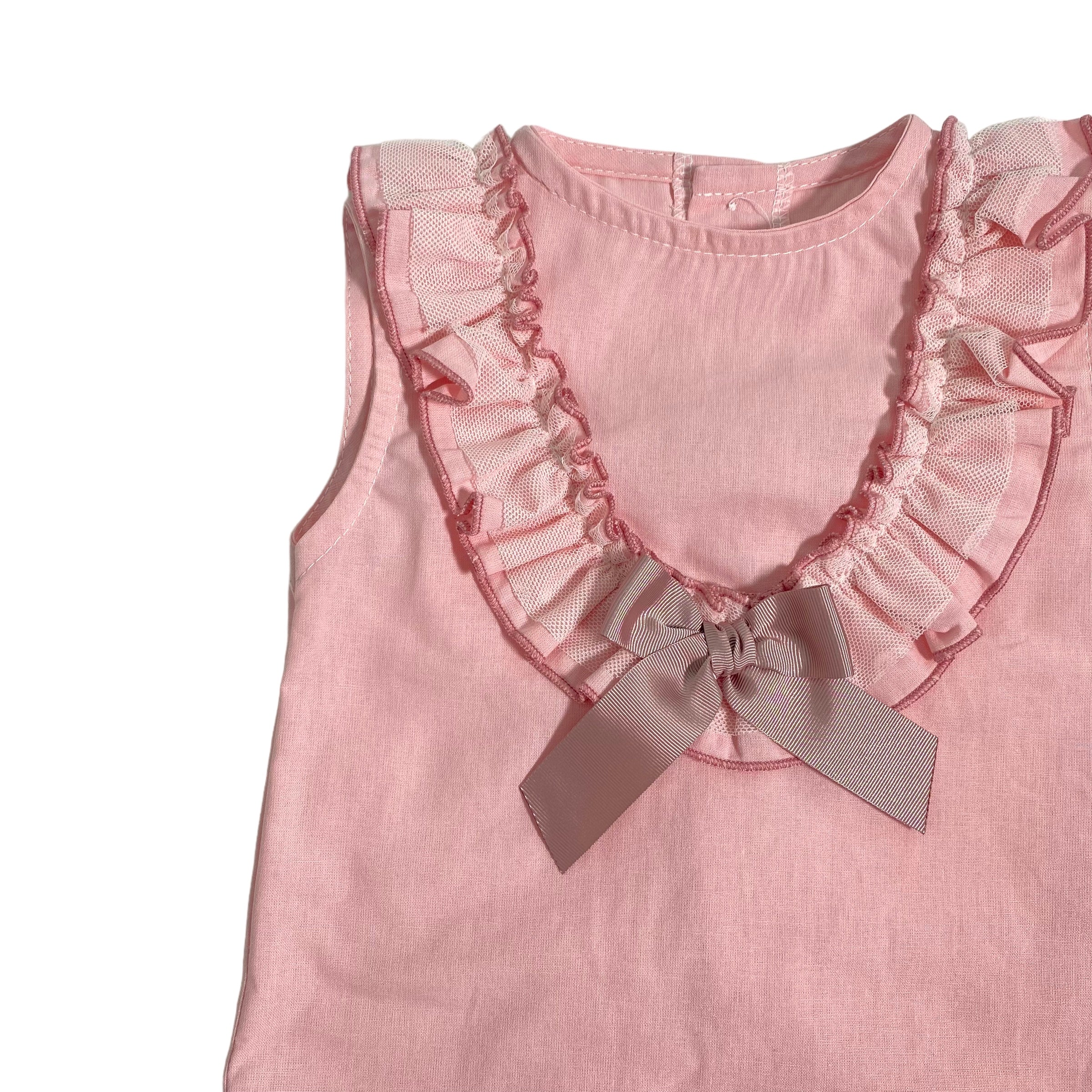 -Ärmellose Baumwollbluse, vorne mit Baumwoll- und Tüllrüschen und Groisgrain-Schleife verziert, hinten mit Perlmuttknöpfen geöffnet
