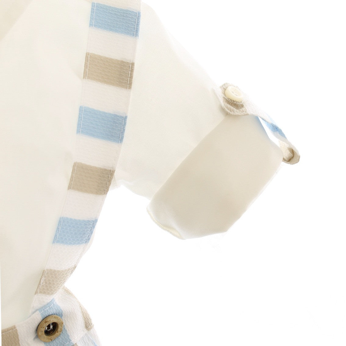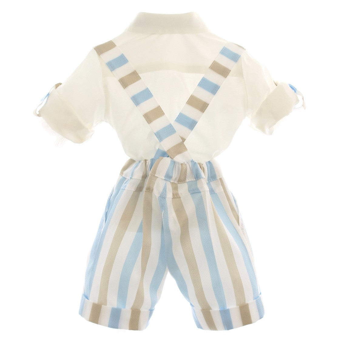 Bermuda-Shorts mit hellblau-weiß-beigem Streifenmuster. Bündchen am Bein. Frontöffnung mit Knopf und unsichtbarem Reißverschluss. Hosenträger mit dem gleichen Muster, die mit einem Knopf auf der Vorderseite befestigt sind. Taschen an der Bermuda-Shorts an der Seite.