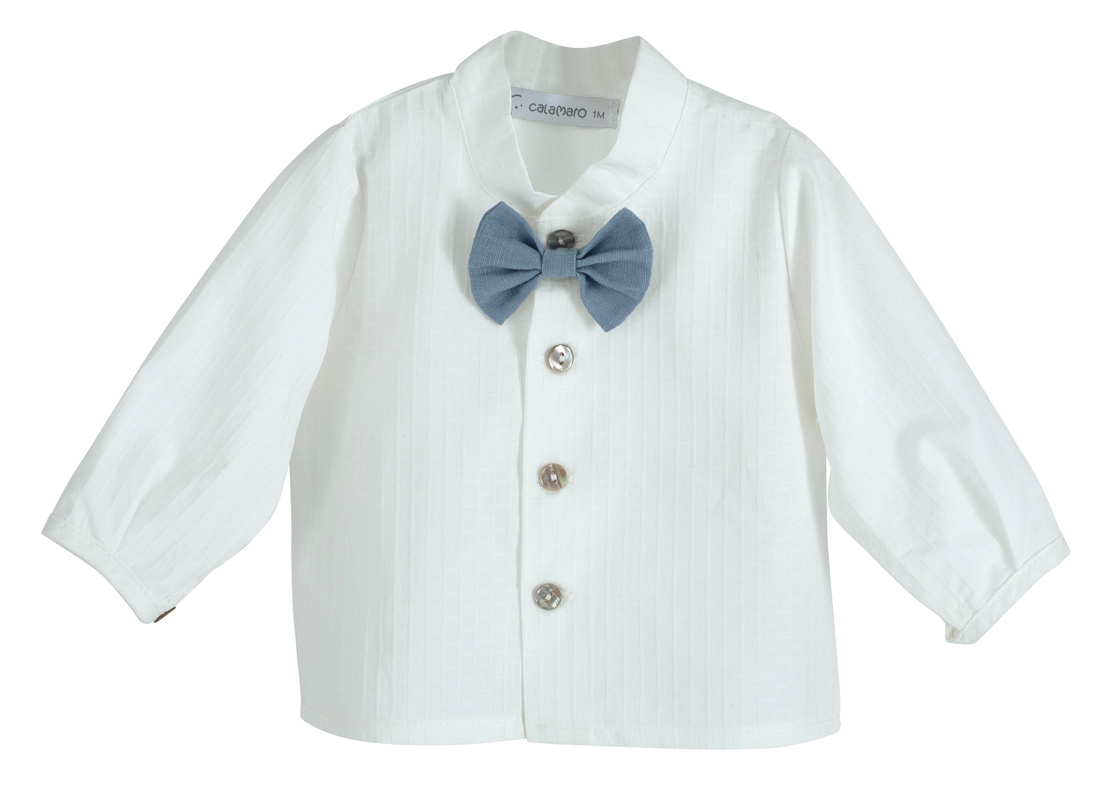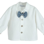 Completo elegante e raffinato per neonati, perfetto per cerimonie! Il bermuda in lino si abbina alla camicia con maniche lunghe e papillon, per un look chic e sofisticato. Con il suo collo a pistagnina, il Completo Con Bermuda E Camicia Neonato CALAMARO 11146 sarà perfetto per il tuo piccolo!
