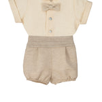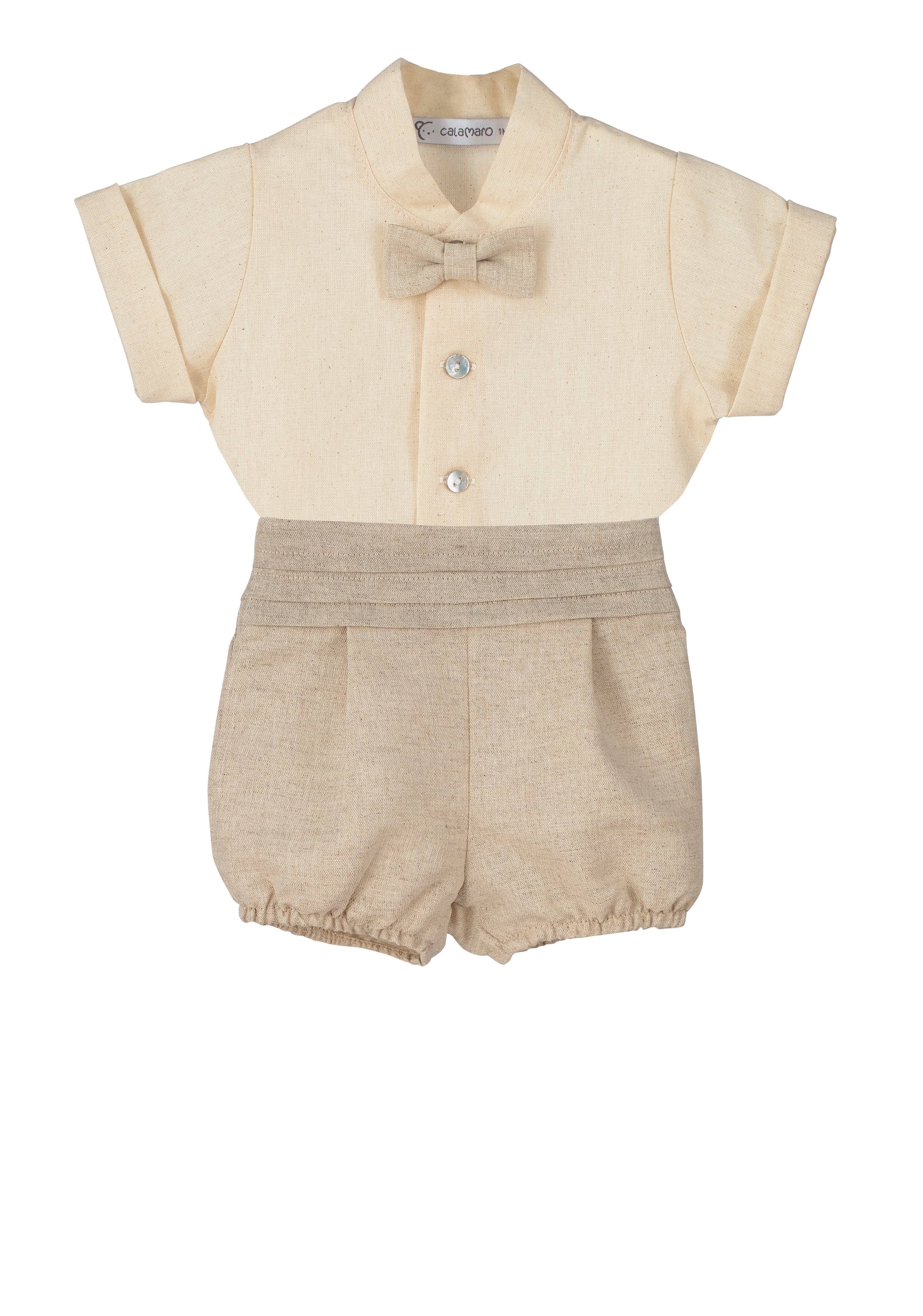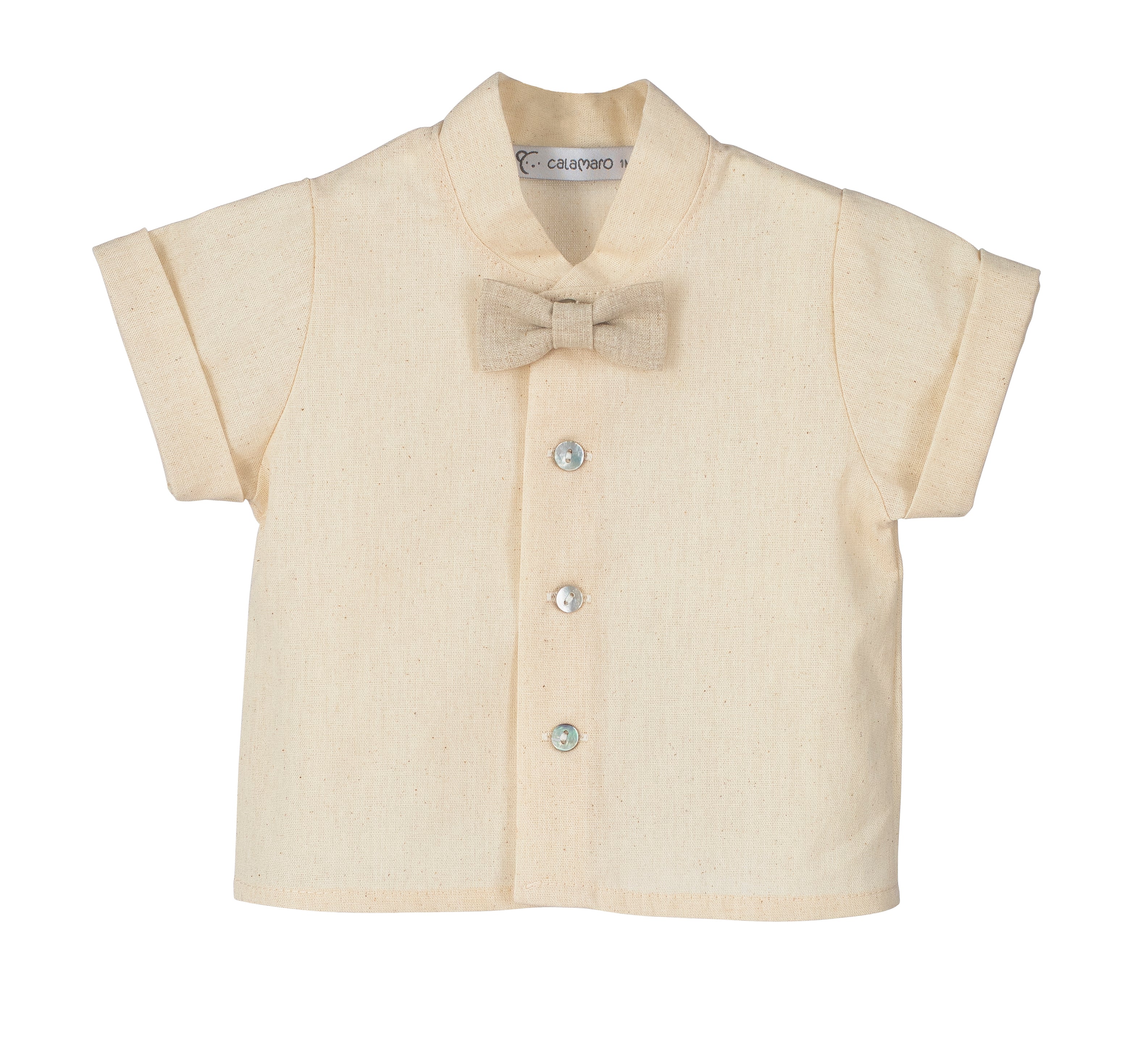 Questo completo neonato CALAMARO comprende una bermuda e una camicia mezza manica con collo pistagnina e papillon. Elegante e casual allo stesso tempo, perfetto per un look chic per il tuo piccolo. Confortevole e alla moda grazie ai tessuti di alta qualità e al design raffinato.