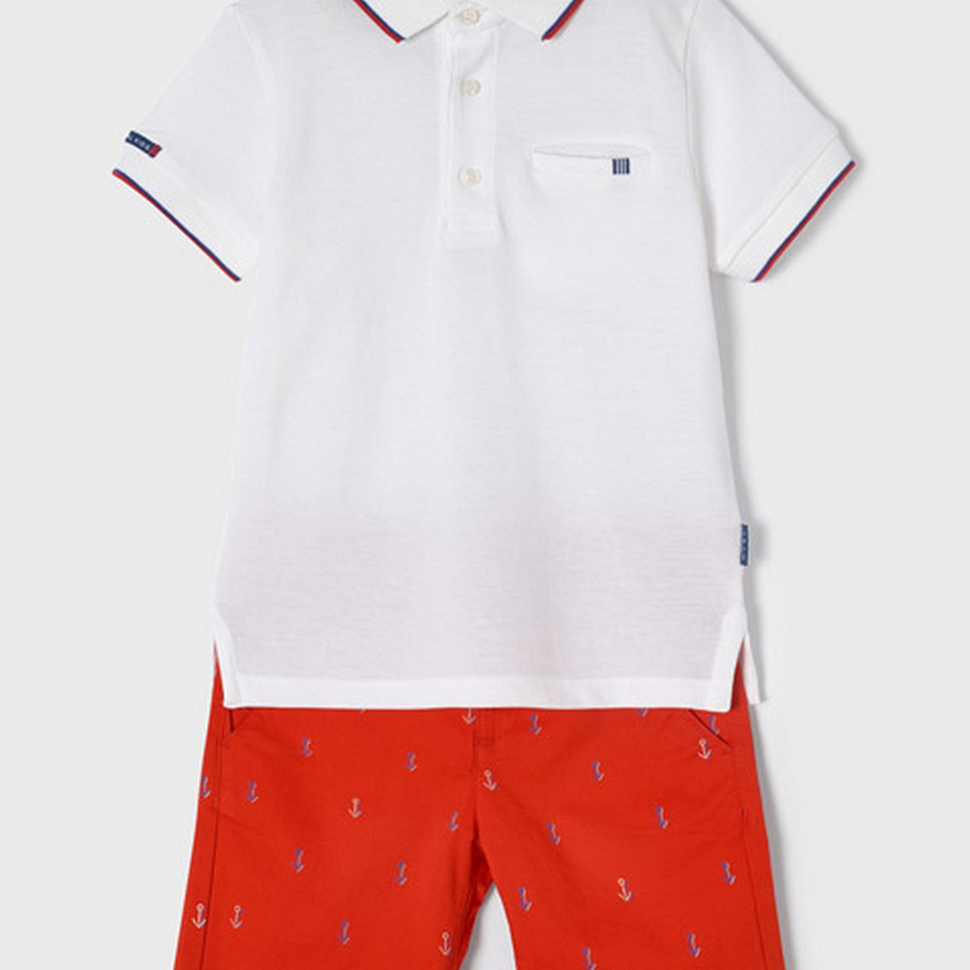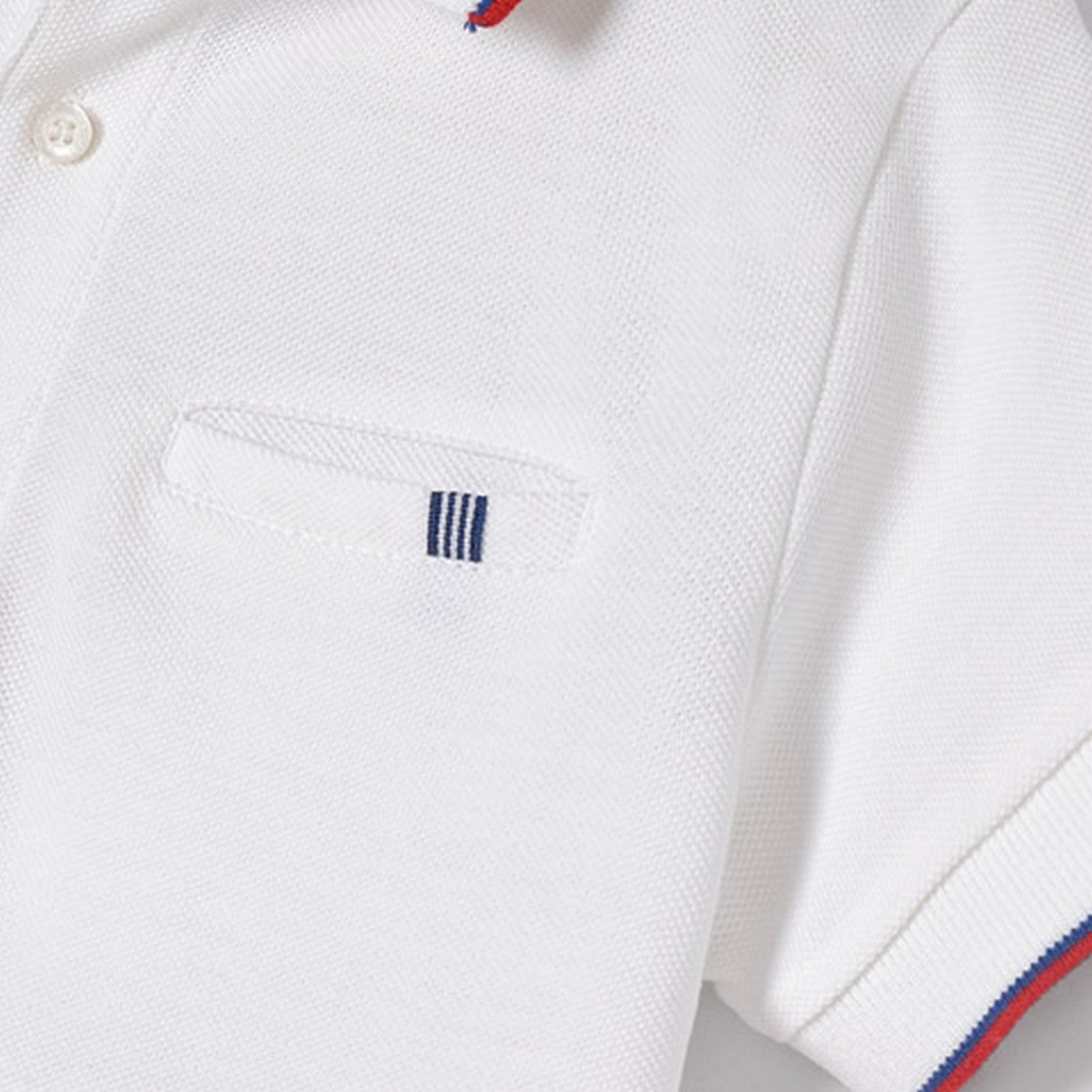 - Weißes einfarbiges Poloshirt mit roten und blauen Details. Spitzkragen und Tasche rechts.