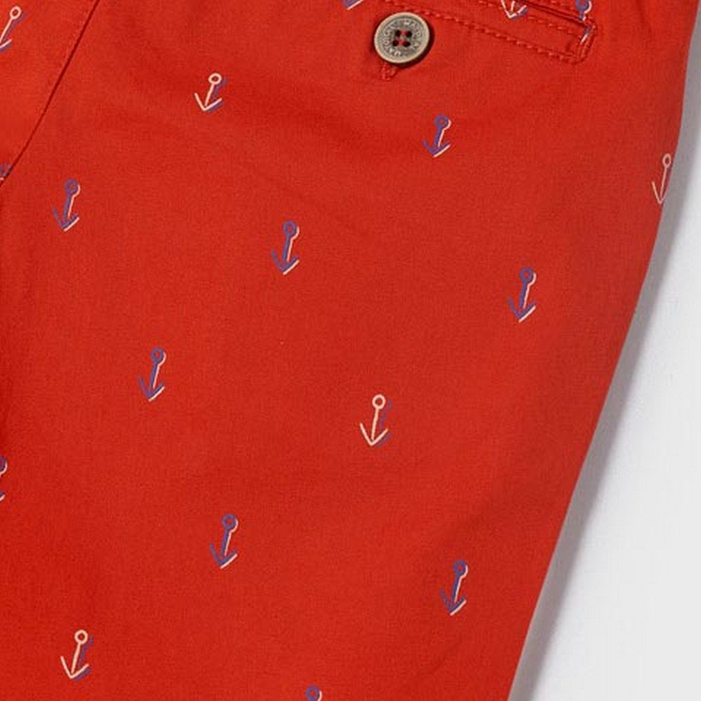 - Bermuda in einfarbigem Rot mit blauen und beigen Details. Seiten- und Fake-Taschen auf der Rückseite.