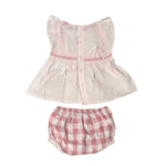 Baumwoll-Outfit bestehend aus rosa karierten Culottes mit Schleife und Plumetis-Baumwollhemd.