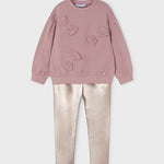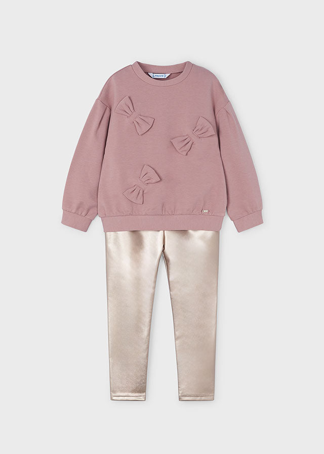 Completo elegante e alla moda per bambina con leggings effetto pelle metallizzato e felpa con fiocchi. Realizzato in caldo cotone, pratico e perfetto per ogni occasione. Acquistalo ora e completa il guardaroba della tua bambina con stile!
