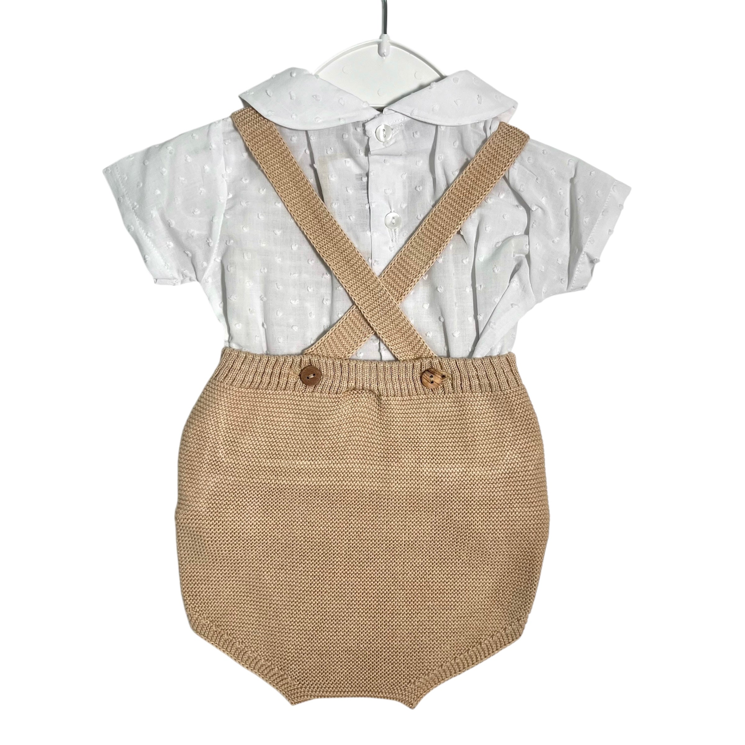 Esclusivo completo con camicia in cotone, decorata con delicati dettagli plumetis, e pagliaccetto in morbido misto cotone. Perfetto per un look casual e alla moda per i neonati. Realizzato con materiali di alta qualità, offre il massimo comfort per la pelle delicata del tuo bambino/a.