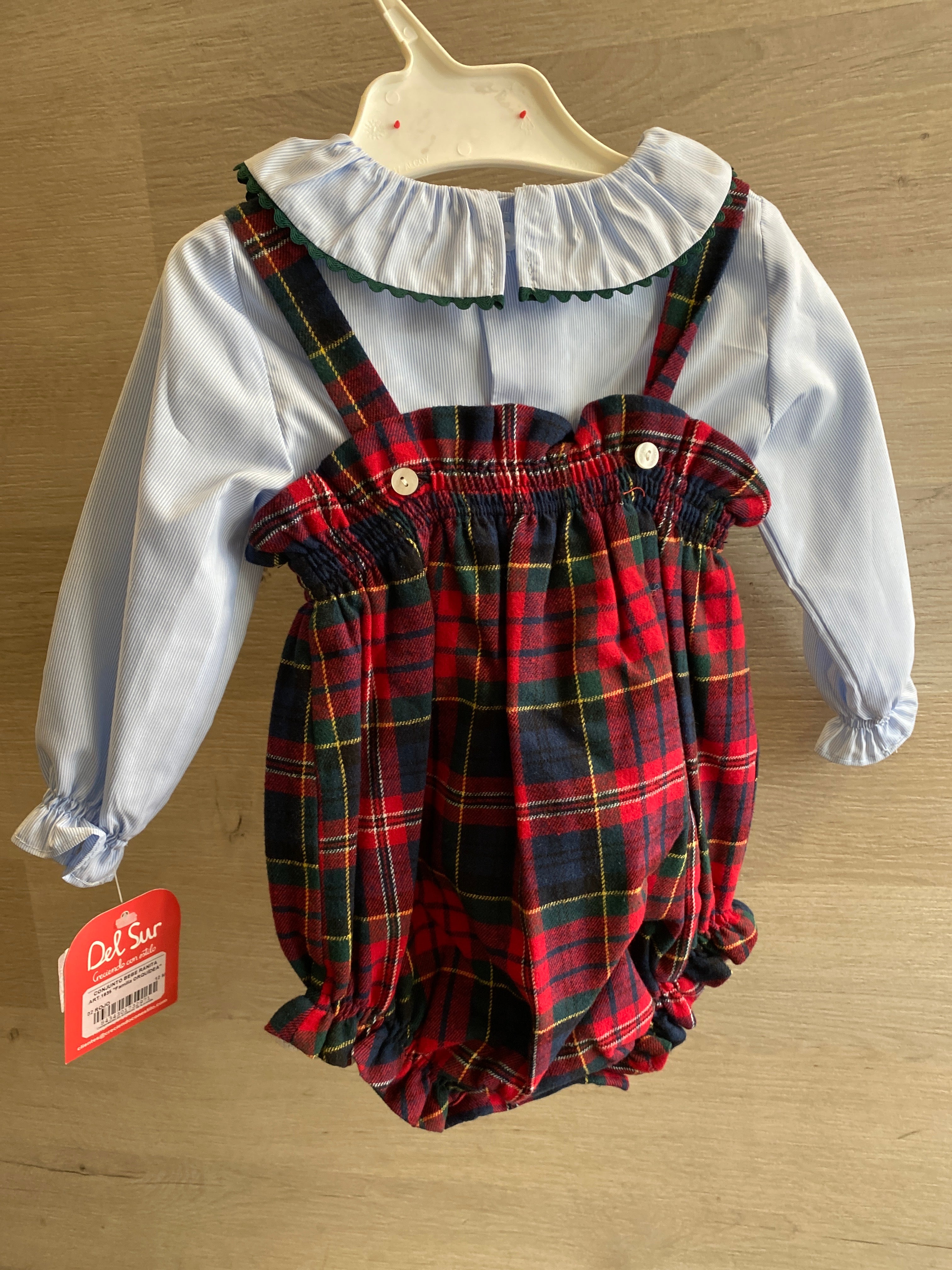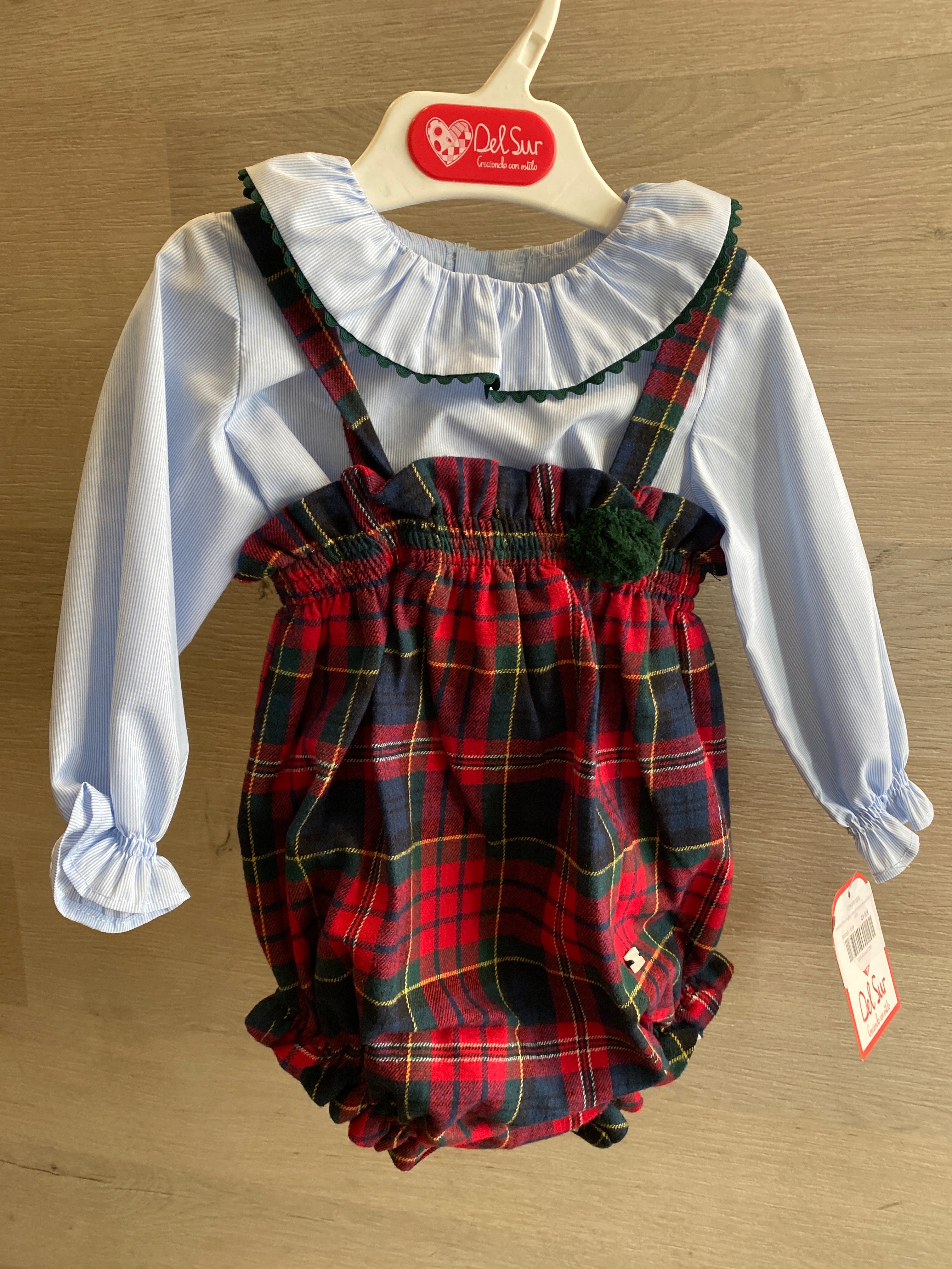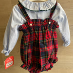 -roter Strampler mit Schottenmuster und Bommel auf der Vorderseite