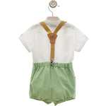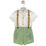 Questo completo con salopette e camicia è perfetto per i neonati. Realizzato in fresco e resistente misto lino, il completo offre un look moda e chic. Le bretelle elastiche e i bottoncini effetto legno garantiscono un'ottima vestibilità. La camicia mezza manica in lino con collo coreano completa il look con un tocco di eleganza.