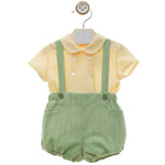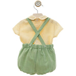 Questo completo per neonato è composto da una salopette effetto lino verde con pratiche bretelle e una camicia mezza manica in vichy gialla con collo tondo e bottoncini sul davanti. Un look casual ma chic, ideale per il tuo piccolo.