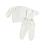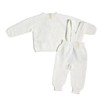 Set aus warmer Bio-Baumwolle in einfarbigem Cremeton, bestehend aus Latzhose mit Hosenträgern und Pullover mit Holzknöpfen, mit Perforationen.