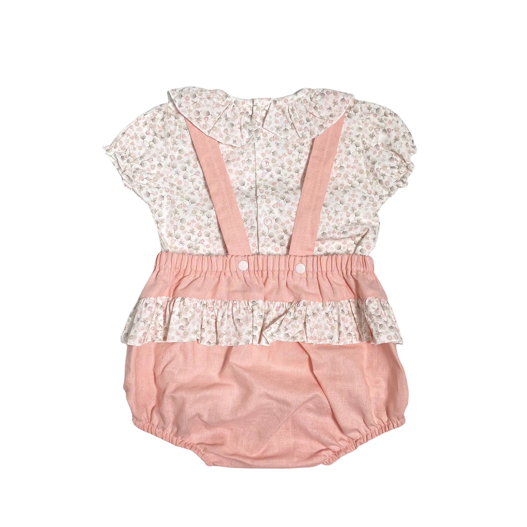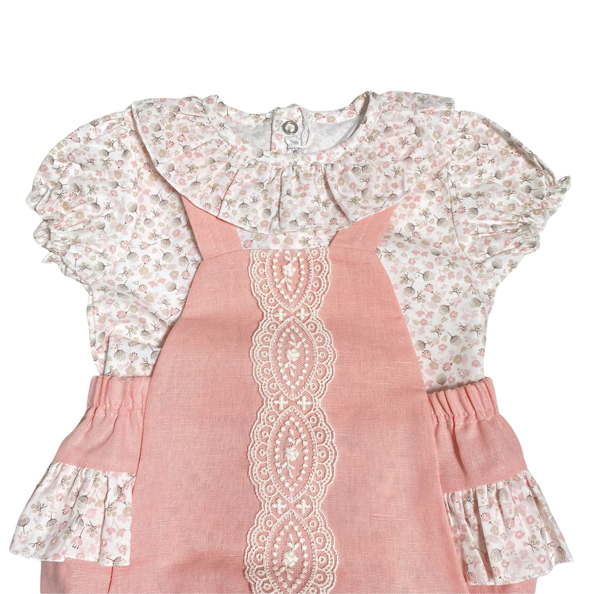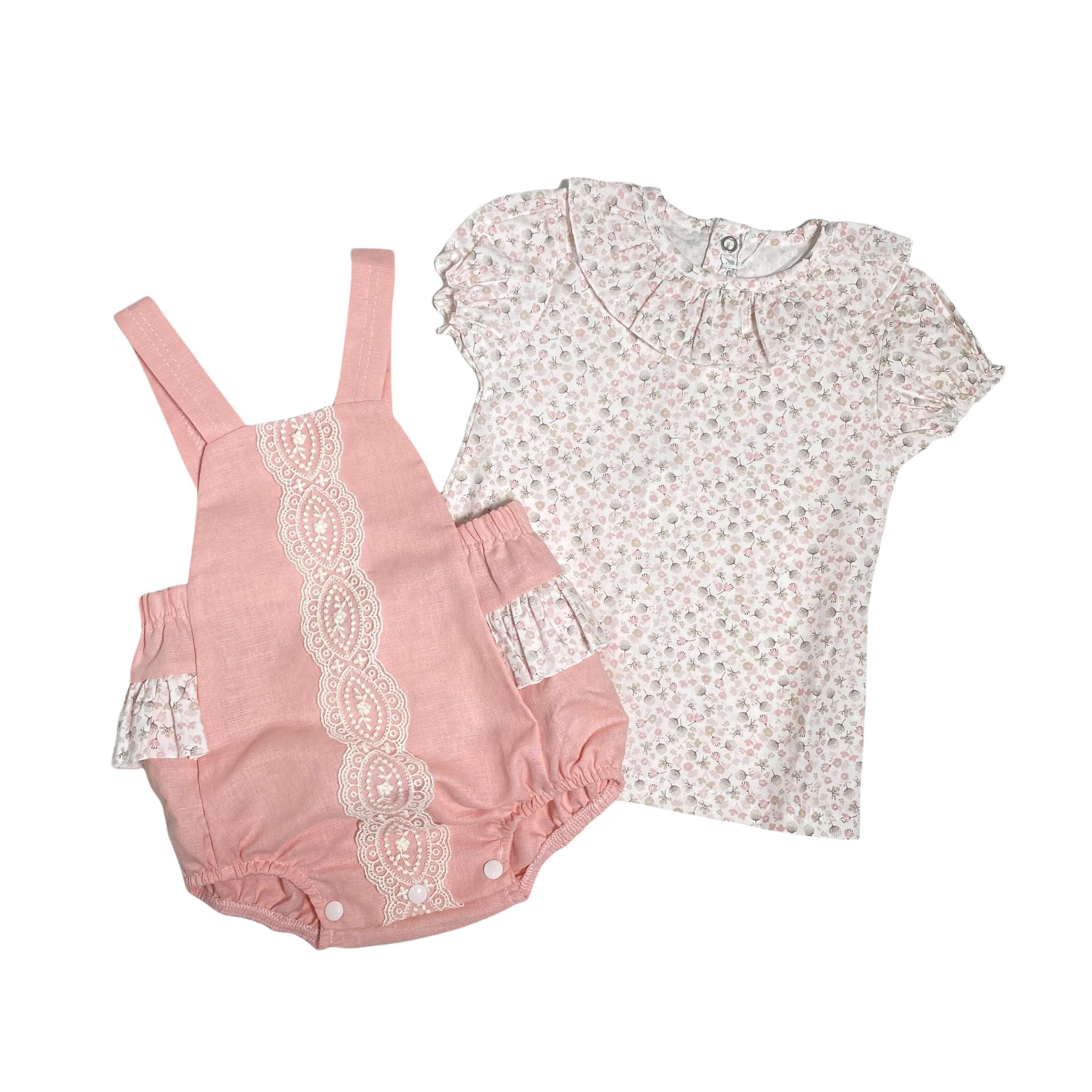 Set bestehend aus einer Latzhose aus einfarbigem Leinen-Mix in Rosa mit Spitzenband auf der Vorderseite und einem Hemd mit halben Ärmeln in Blumenmuster.