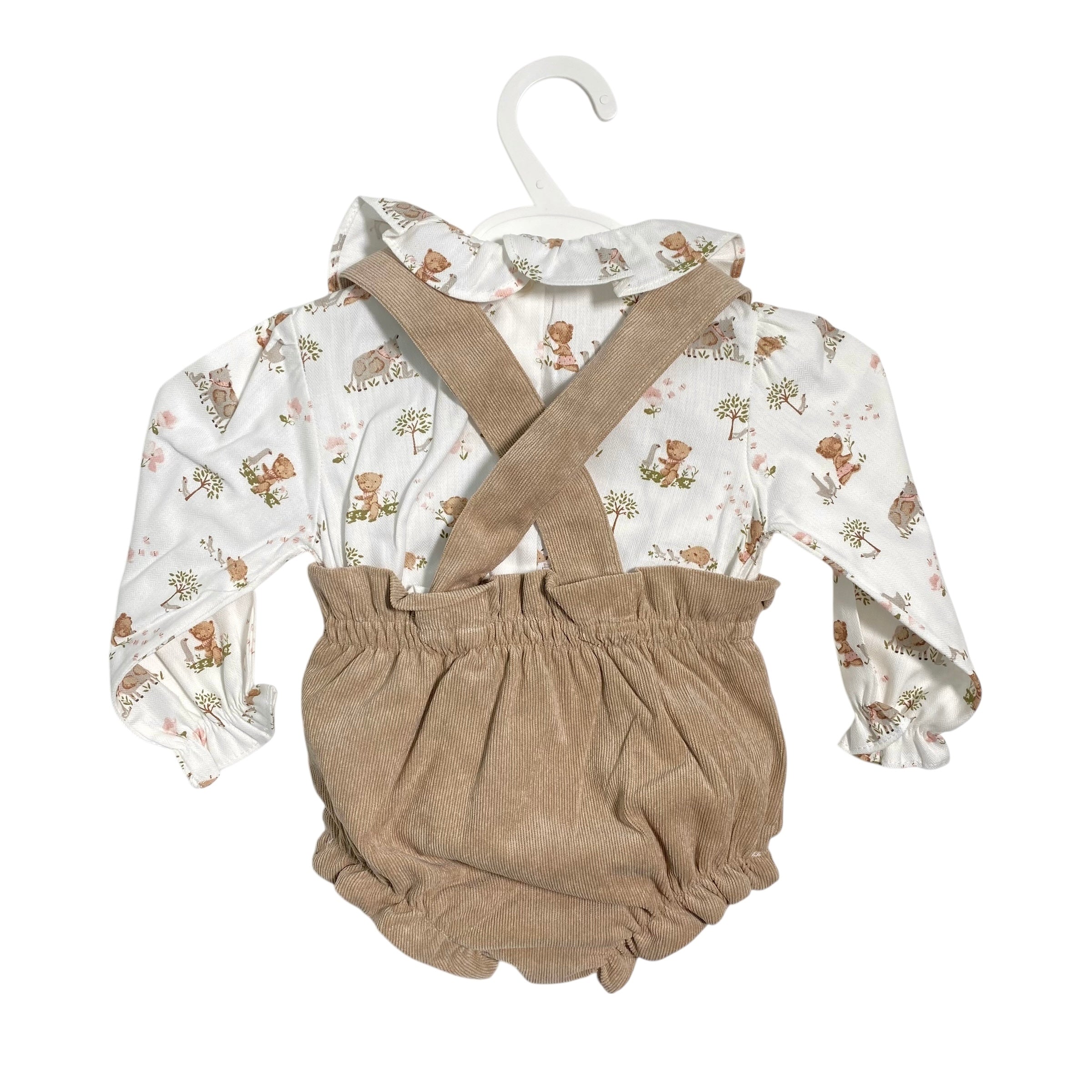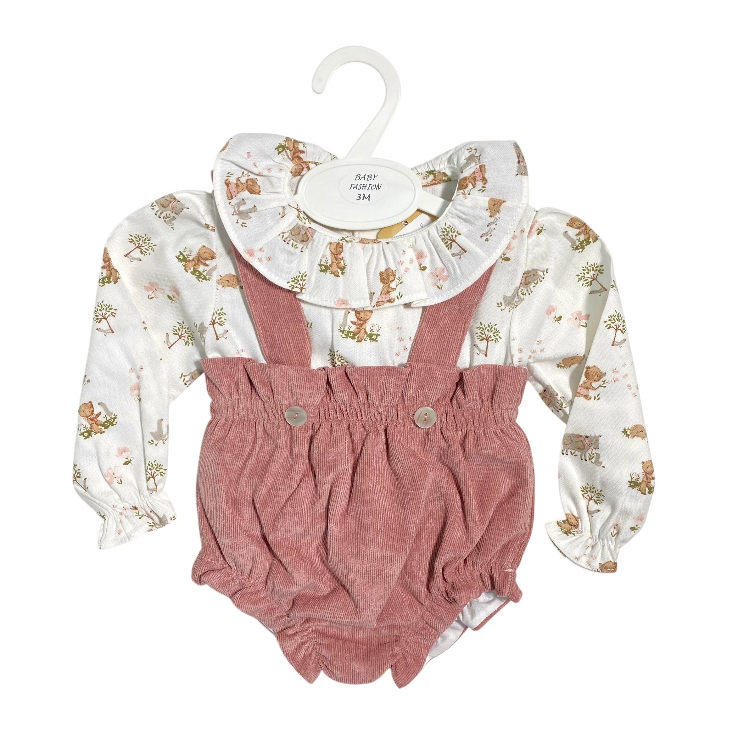 Questo completo per neonata unisce una salopette corta in velluto millerighe, morbida ed elegante, a una camicia stampata con collo tondo, conferendo stile e comfort. Perfetto per occasioni speciali o per un look alla moda, combina materiali di qualità con un design sofisticato, ideale per vestire la tua piccola con raffinata praticità.