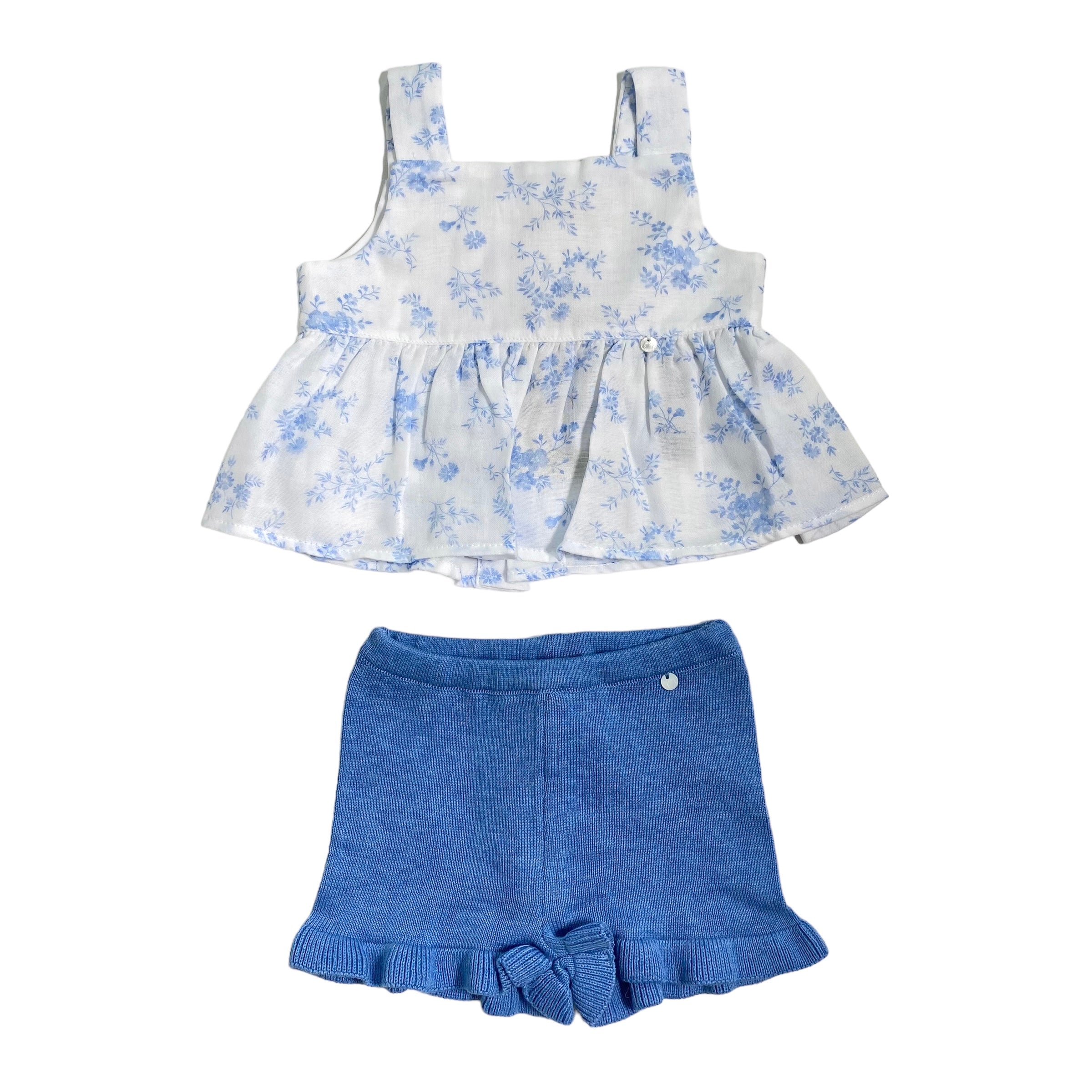 Set bestehend aus Shorts aus Baumwollgarn in schlichtem Blau und einer Bluse mit Hosenträgern aus Baumwollgaze mit Blumenmuster.