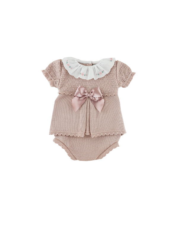 Questo completo corto è l'ideale per l'uscita clinica della tua piccola neonata. Il set comprende un pratico paio di culotte e una maglia con un elegante collo rouches ricamato e un fiocco in raso sul petto. Un corredino perfetto per un'occasione speciale, che unisce comodità ed eleganza.