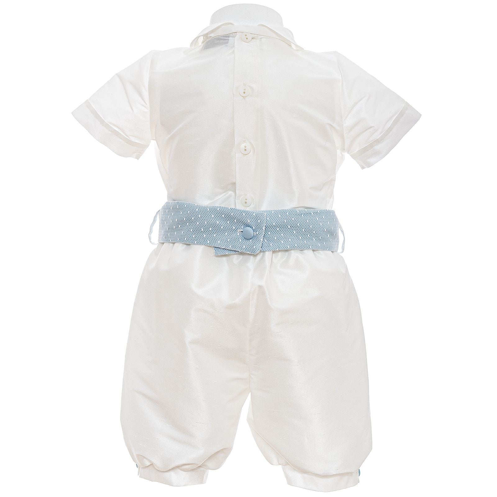 Elegantes weißes Strampler-Modell-Set bestehend aus Satinhemd mit Rundkragen und Mittelband aus gepunktetem Tüll. Öffnung auf der Rückseite mit Knöpfen