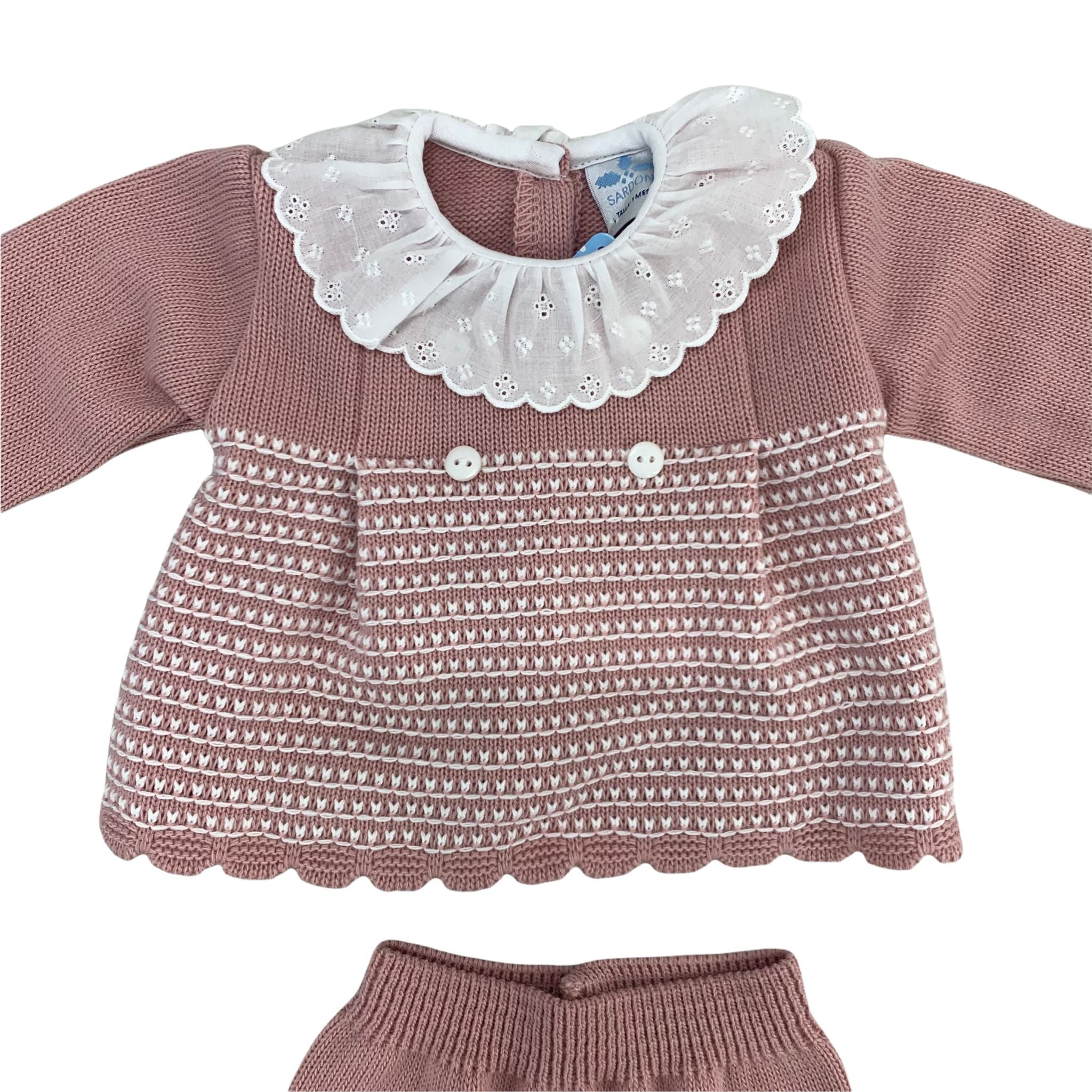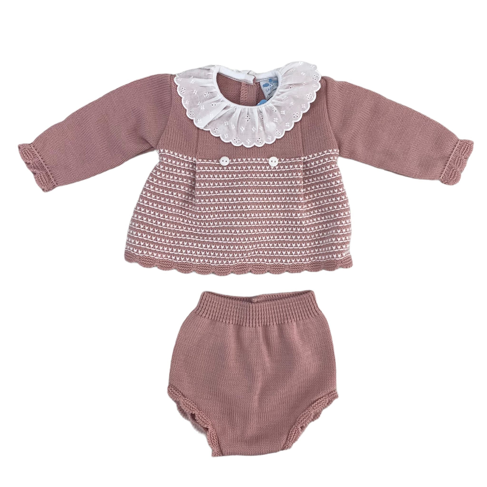 Zweiteiliger Anzug mit warmer Baumwollcoulotte mit geprägten weißen Nähten und Knöpfen auf der Vorderseite. Runder Blumenkragen.