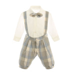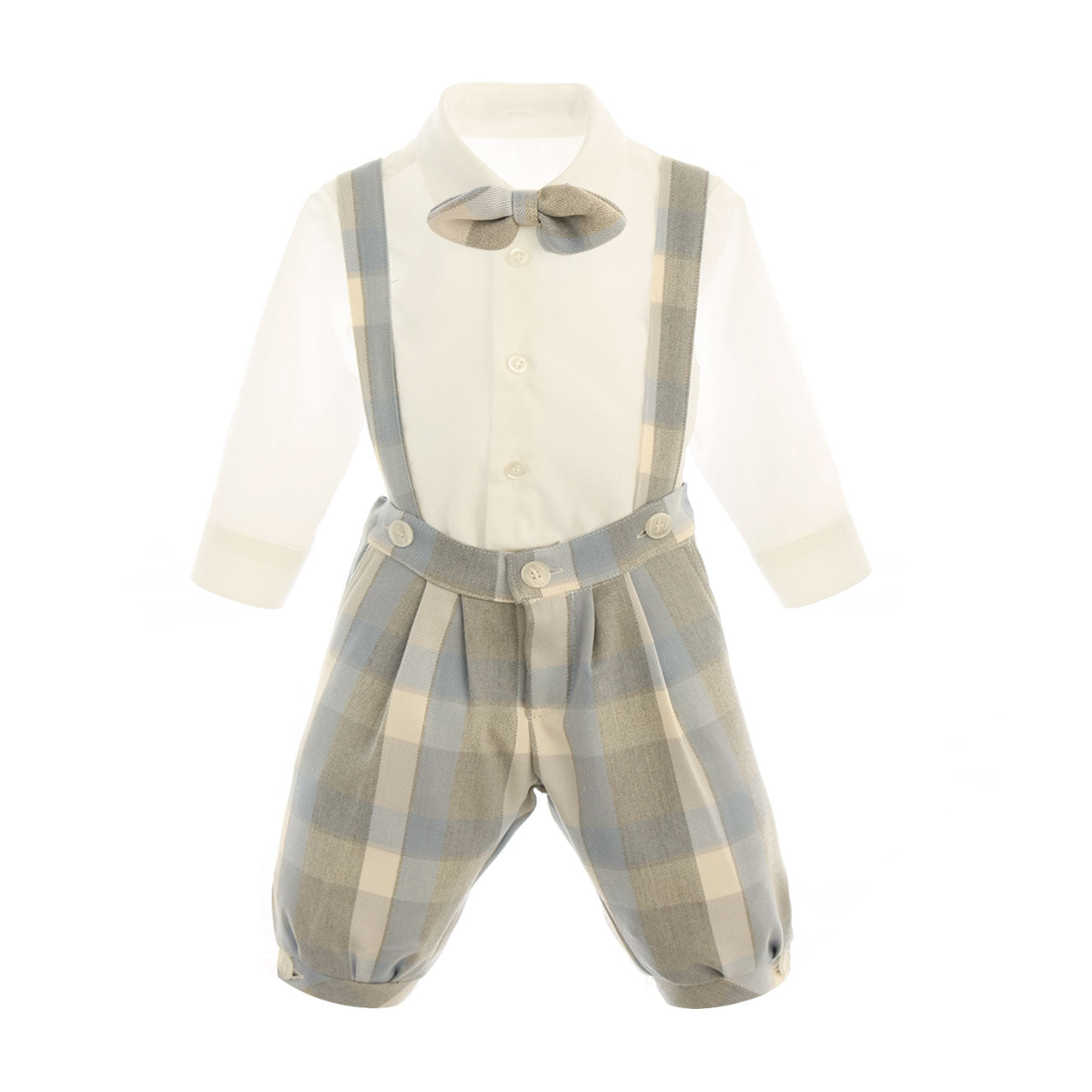 Questo completo elegante per neonato comprende quattro pezzi coordinati per un look raffinato e moderno. Il pantalone rocciatore a quadri con bretelle si abbina perfettamente alla camicia bianca tinta unita, mentre il papillon nel medesimo tessuto del pantalone aggiunge un tocco di classe. Completa il set un cardigan con scollo a V, ideale per conferire eleganza e comfort nelle occasioni speciali. La combinazione di stile e materiali selezionati rende questo outfit la scelta ideale per eventi formali e momenti importanti del tuo bambino.