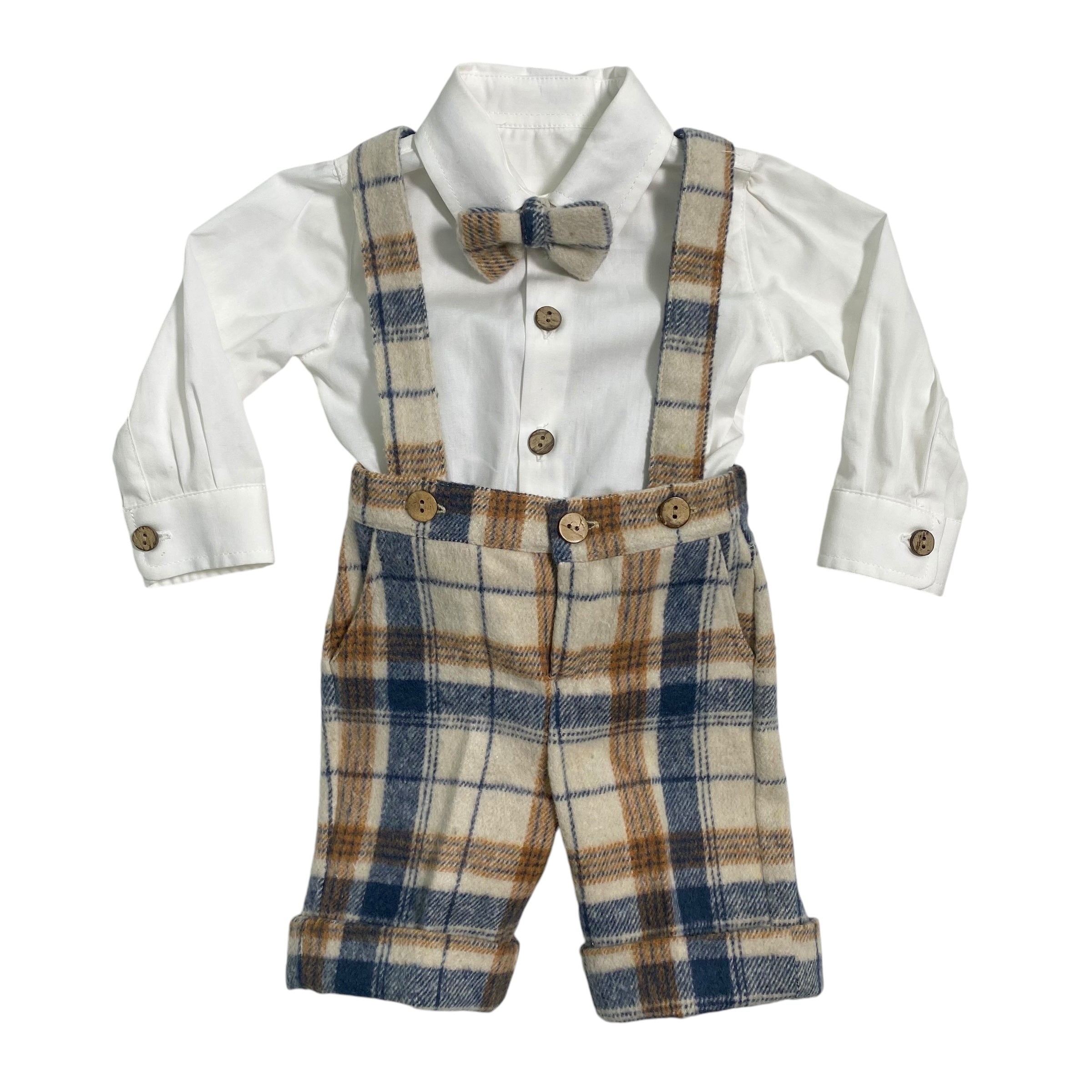 Aggiungi un tocco elegante alle occasioni speciali del tuo neonato con questo completo da 4 pezzi. Pantalone corto in lana cotta con bretelle, camicia in tinta unita, giacca in velluto millerighe doppiopetto e papillon coordinato. Realizzato in Italia con materiali di alta qualità per un look sofisticato e raffinato.