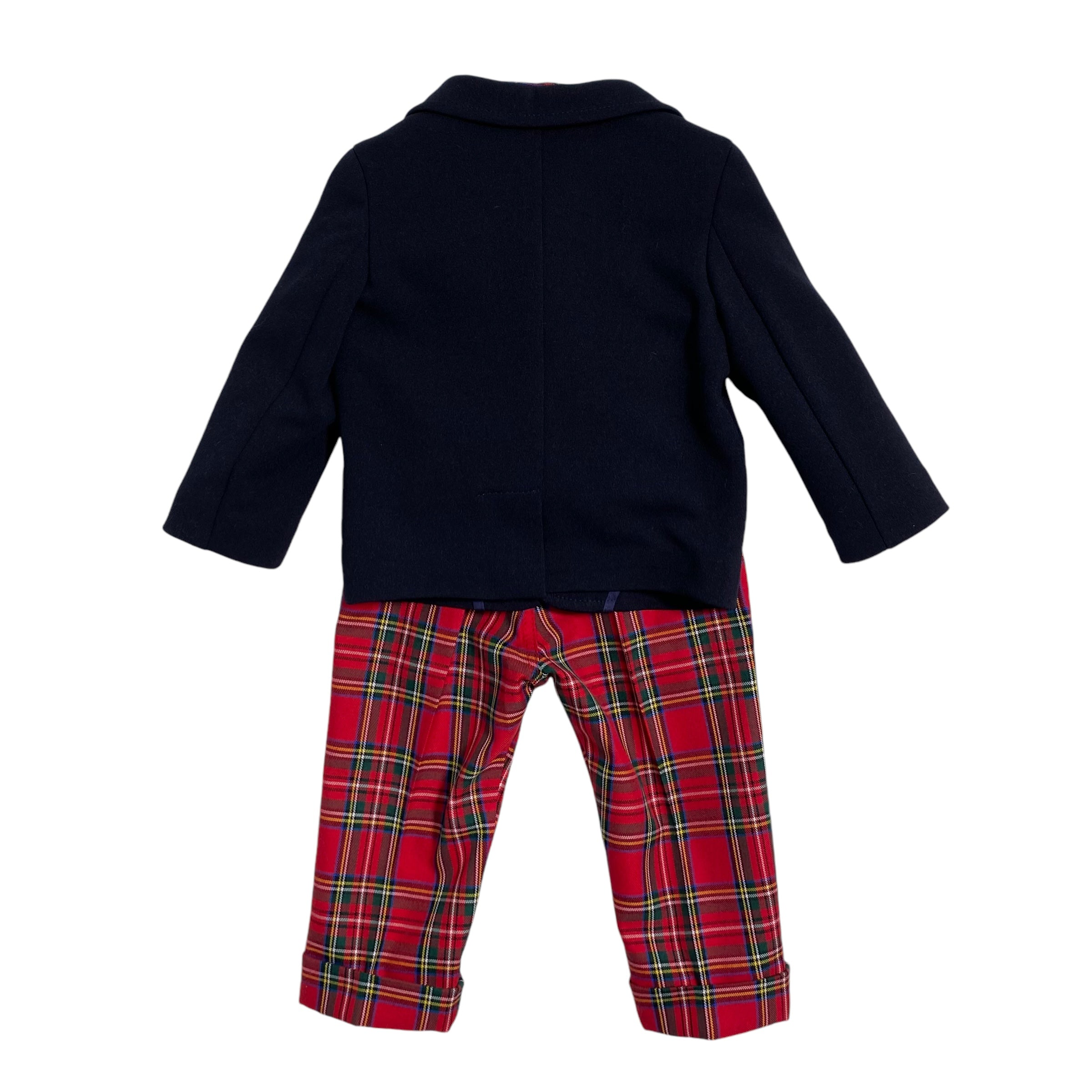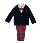 Questo completo elegante è perfetto per una occasione speciale come il Natale. Include un pantalone lungo scozzese, una camicia in tinta unita, una giacca morbida in punto milano blu e un papillon scozzese. Realizzato in Italia, è elegante e raffinato.
