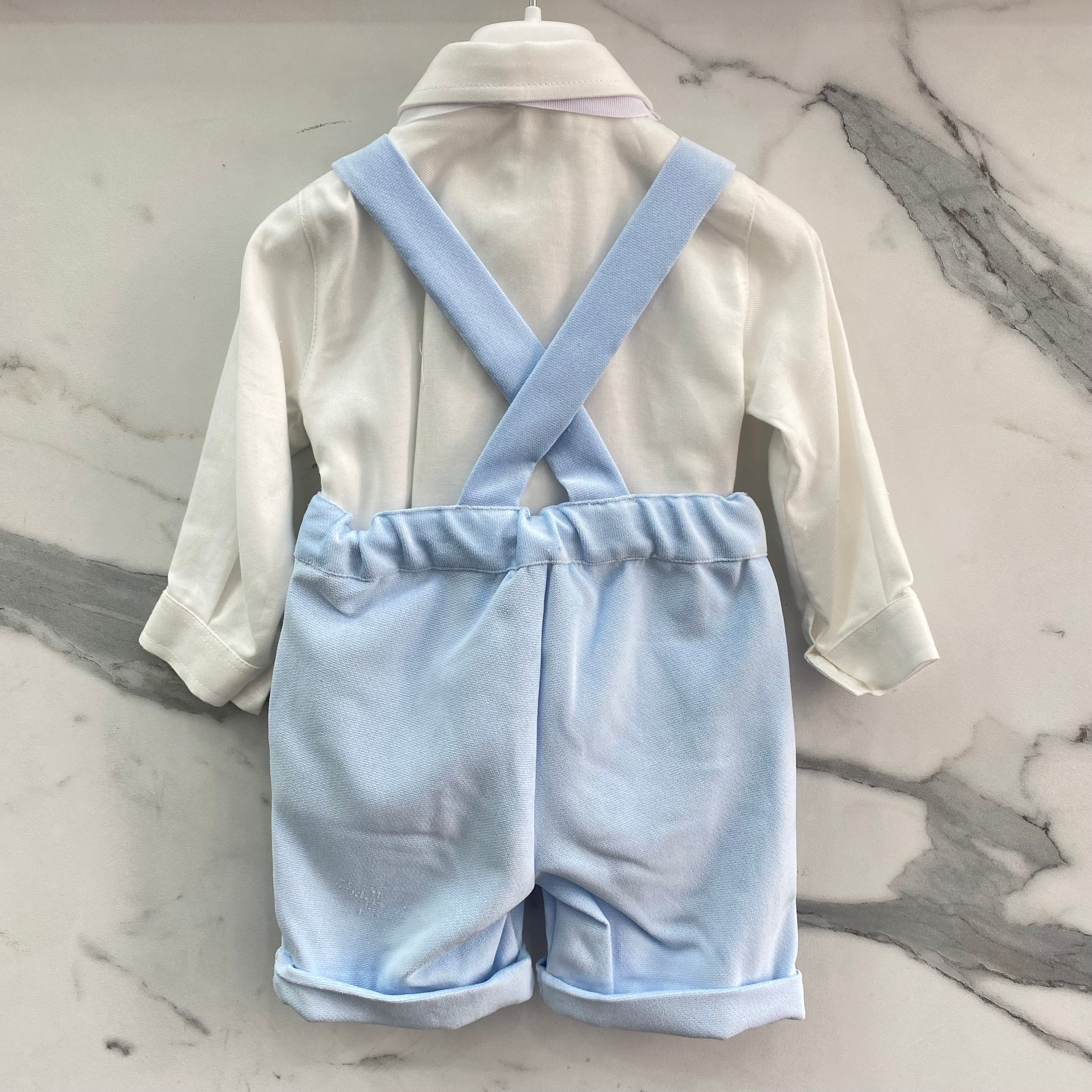 Questo completo elegante in velluto per neonato NINNAOH è perfetto per le occasioni speciali come il battesimo. Composto da bermuda con bretelle, camicia in tinta unita, papillon e giacca in velluto, dona un aspetto elegante al tuo bambino. Un must-have per tutte le famiglie che amano vestire con stile.