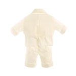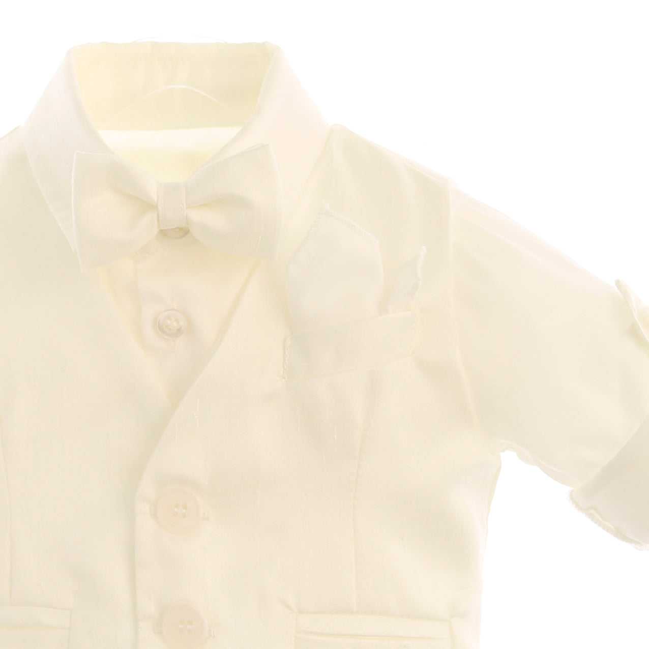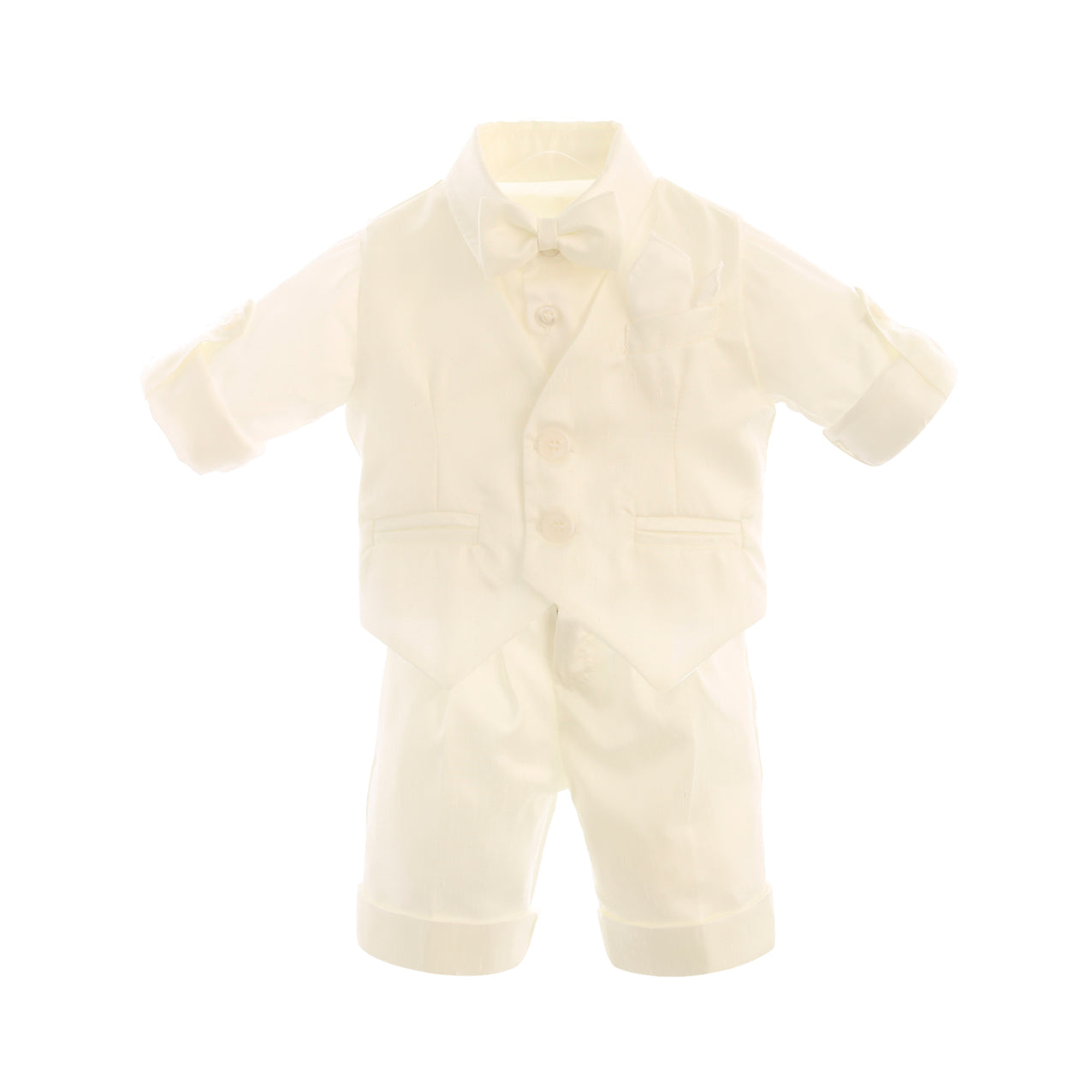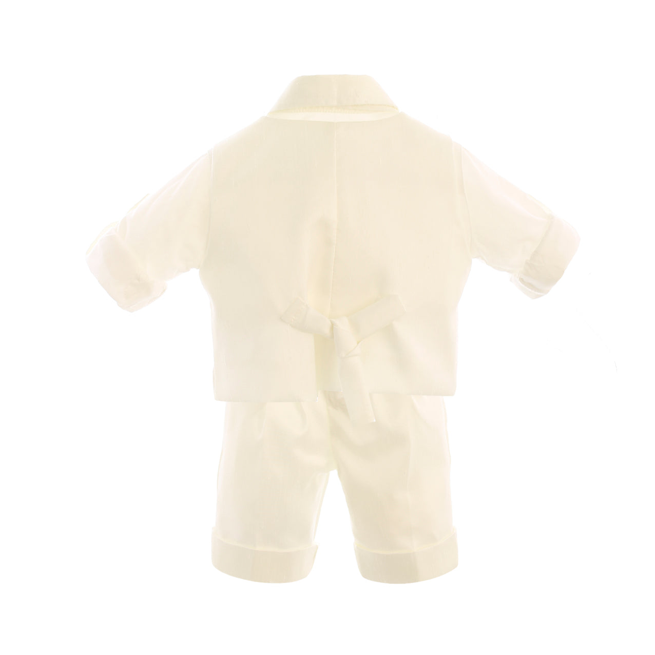 Questo completo elegante per neonati BUFI è perfetto per ogni occasione speciale. Il bermuda panna con bretelle e risvolto, la camicia in cotone con risvolto e il panciotto in tessuto fiammato sono ispirati alla moda italiana e doneranno al tuo bambino un look elegante e raffinato. Completa il look con il papillon e pochette per un tocco ancora più chic.