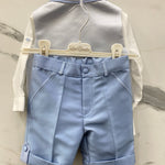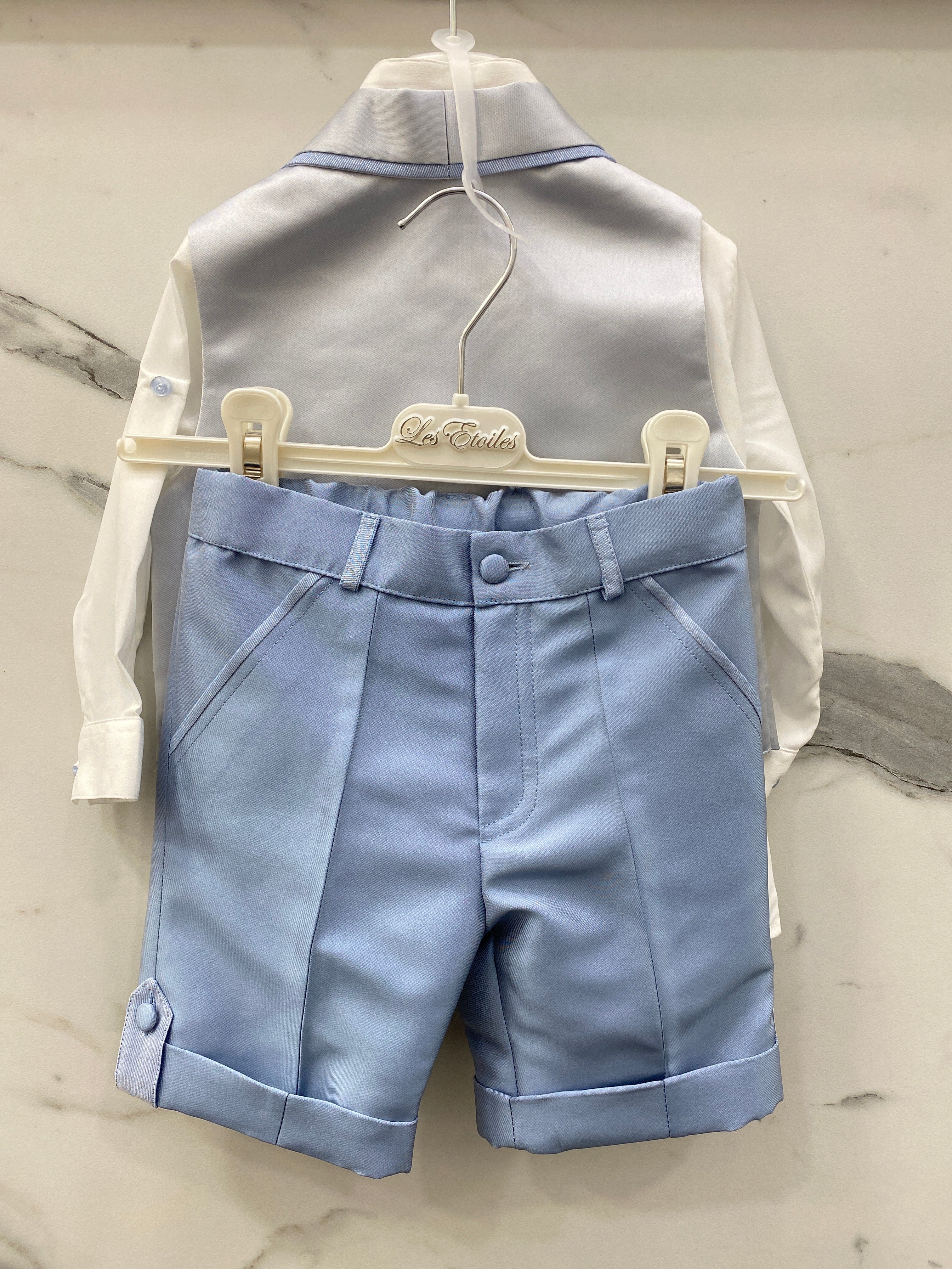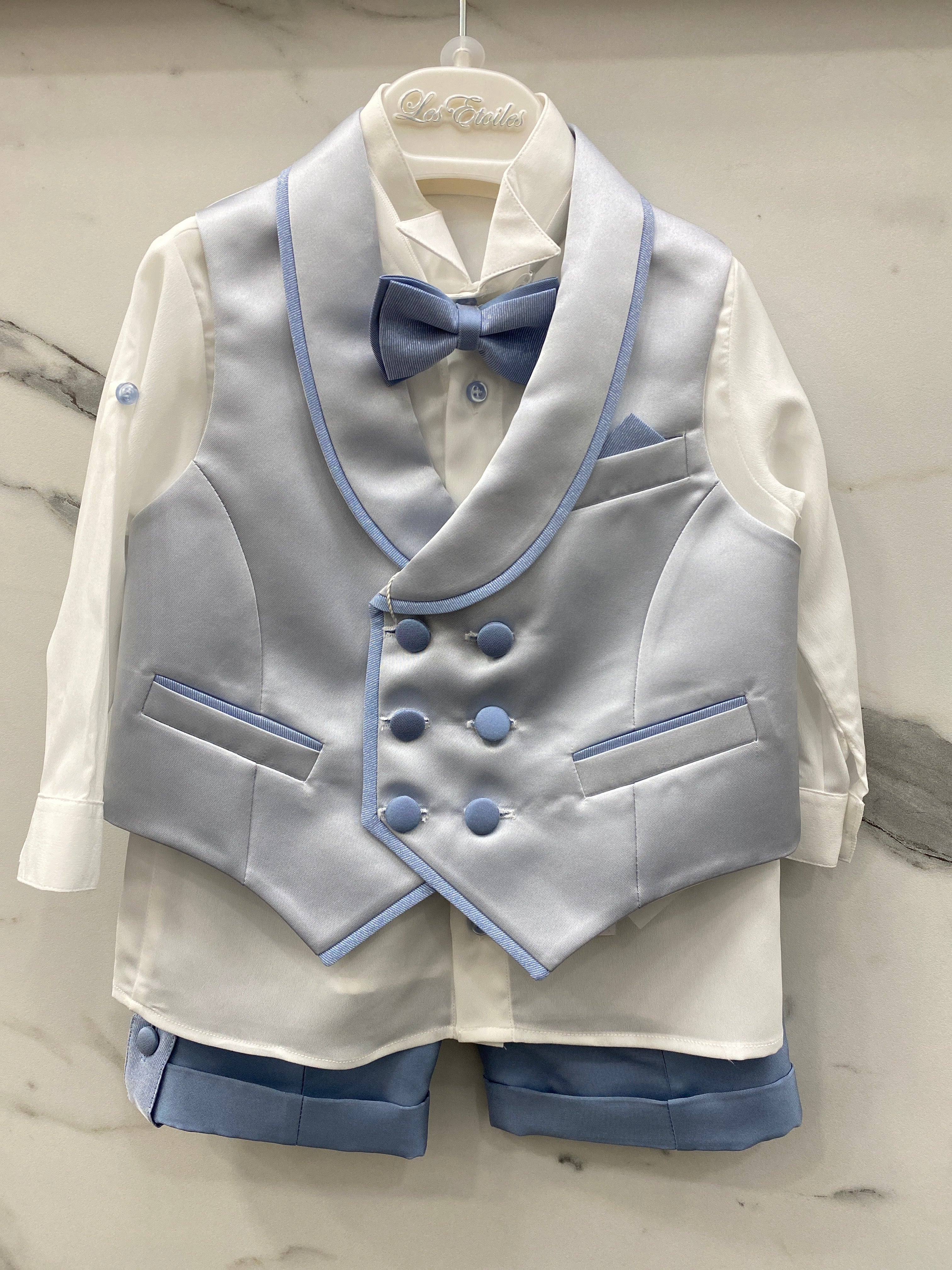 L'outfit LES ETOILES ANTONELLO è perfetto per le occasioni speciali. Il completo è realizzato in raso di alta qualità e comprende una bermuda con risvolto, una camicia in seta con manica risvoltabile, un panciotto con reverse e un papillon abbinato. Progettato e realizzato in Italia per offrire un'eleganza senza paragoni.