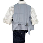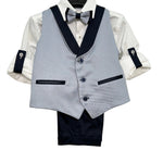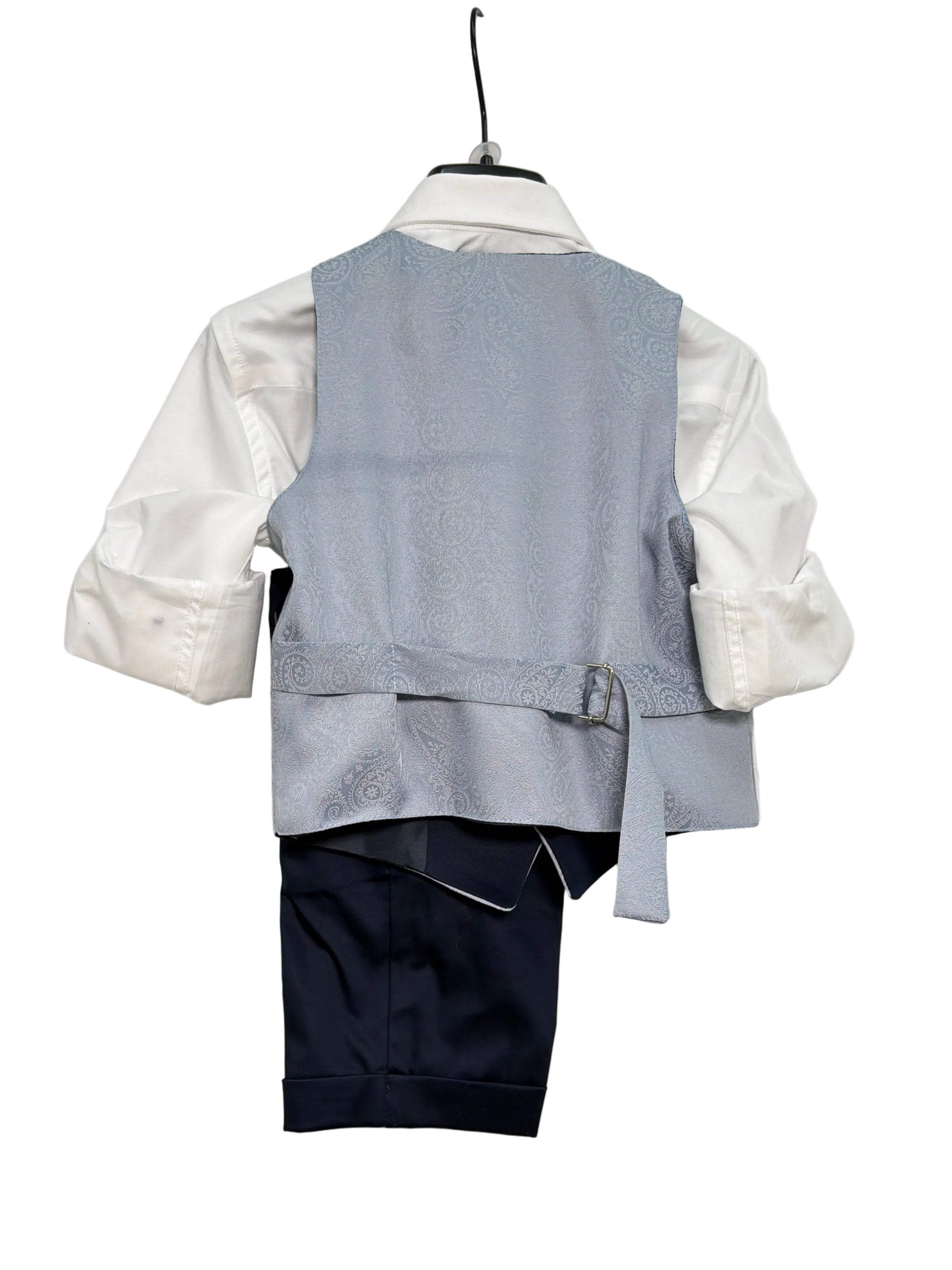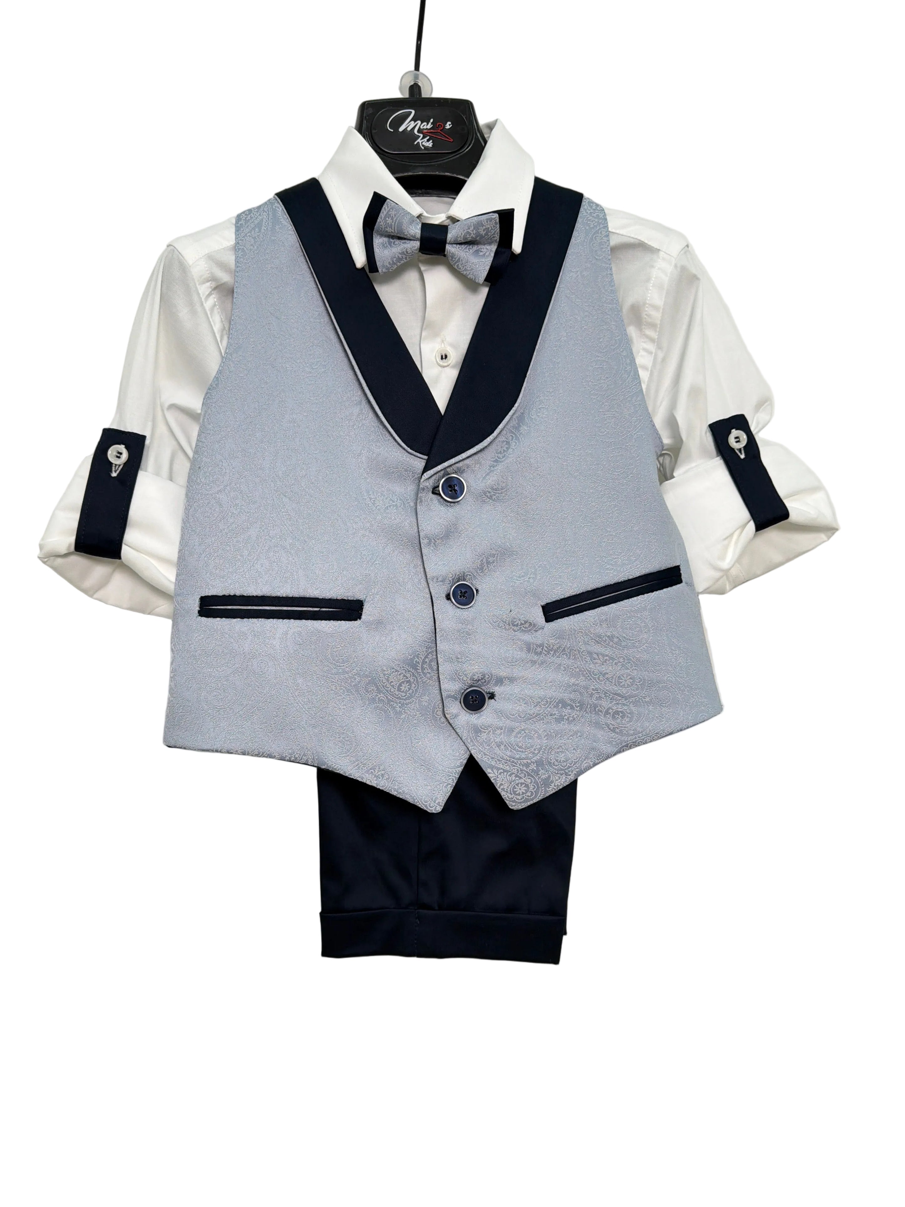 Questo completo elegante per paggetto è composto da bermuda con risvolto, camicia bianca, panciotto damascato e papillon abbinato. Perfetto per far sentire il tuo bambino un piccolo signore il giorno del matrimonio. Con il suo stile raffinato e dettagli curati, garantirà un aspetto elegante e impeccabile.