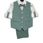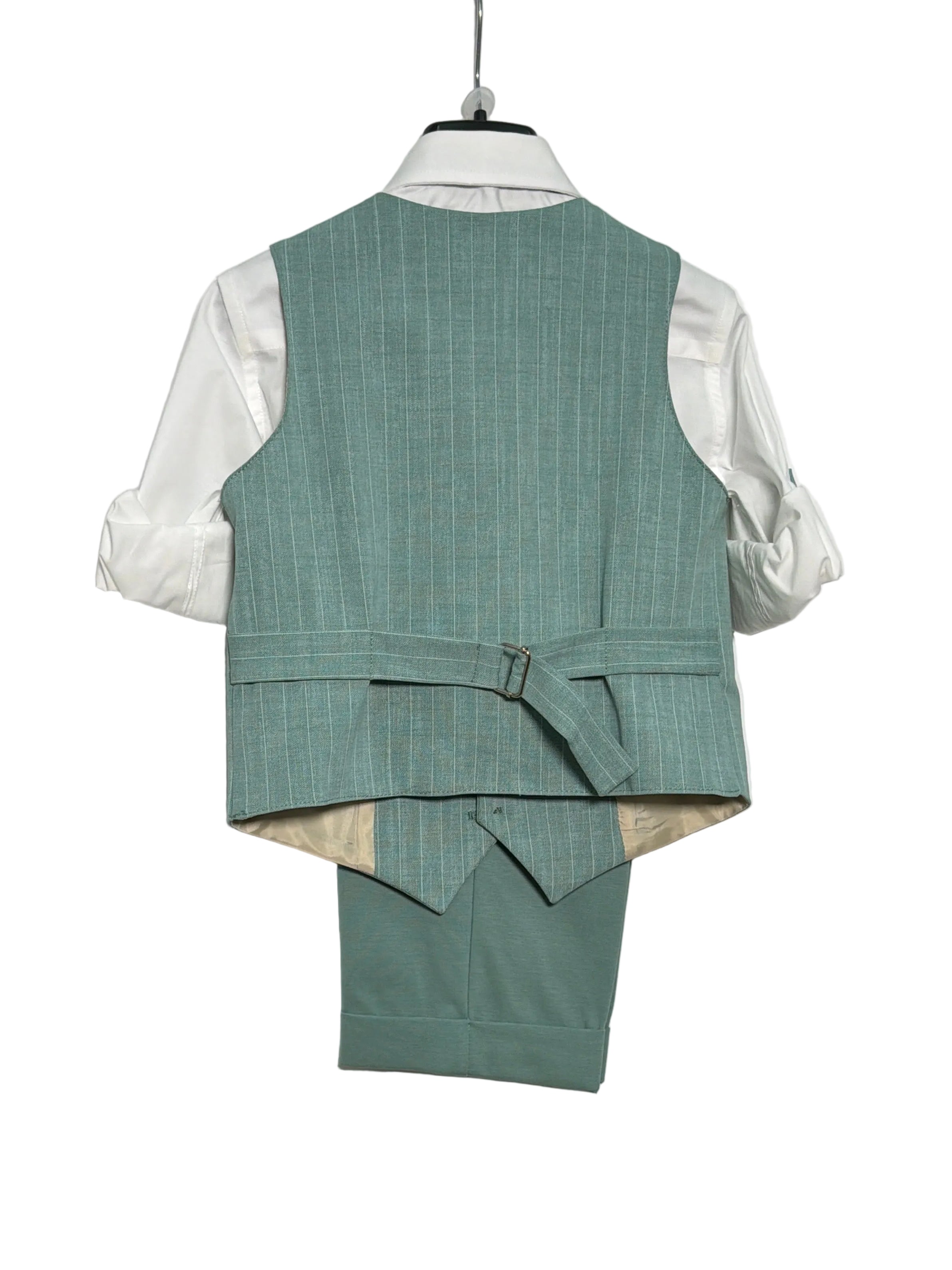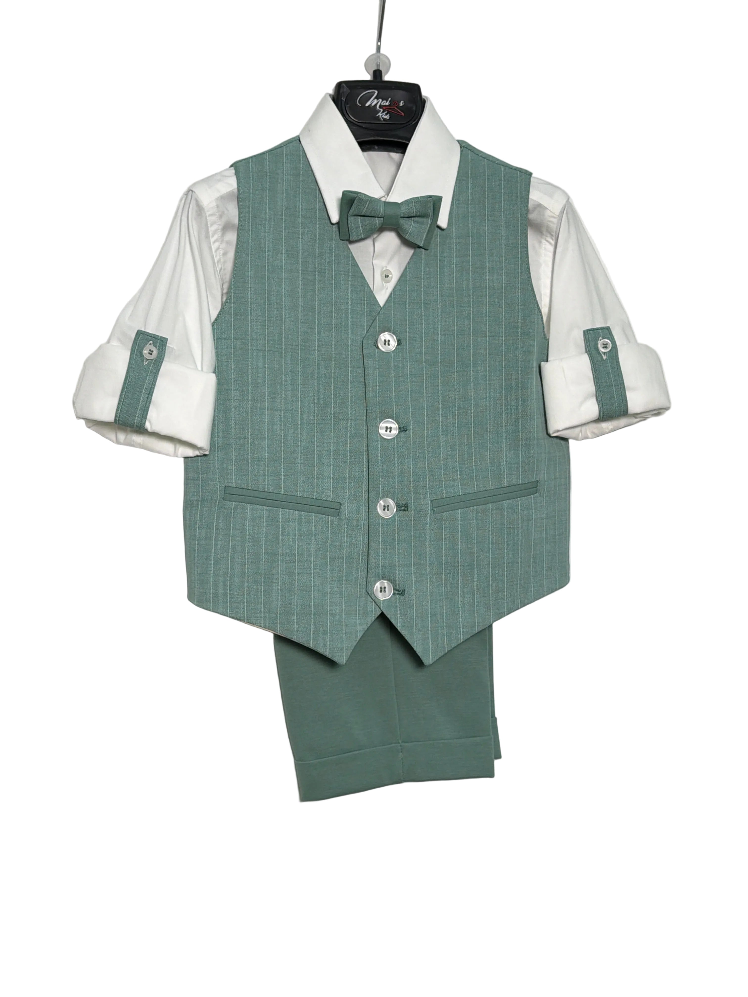 Questo completo elegante per paggetto è composto da bermuda con risvolto in tinta unita, camicia bianca, panciotto con a righe e papillon abbinato. Perfetto per far sentire il tuo bambino un piccolo signore il giorno del matrimonio. Con il suo stile raffinato e dettagli curati, garantirà un aspetto elegante e impeccabile.