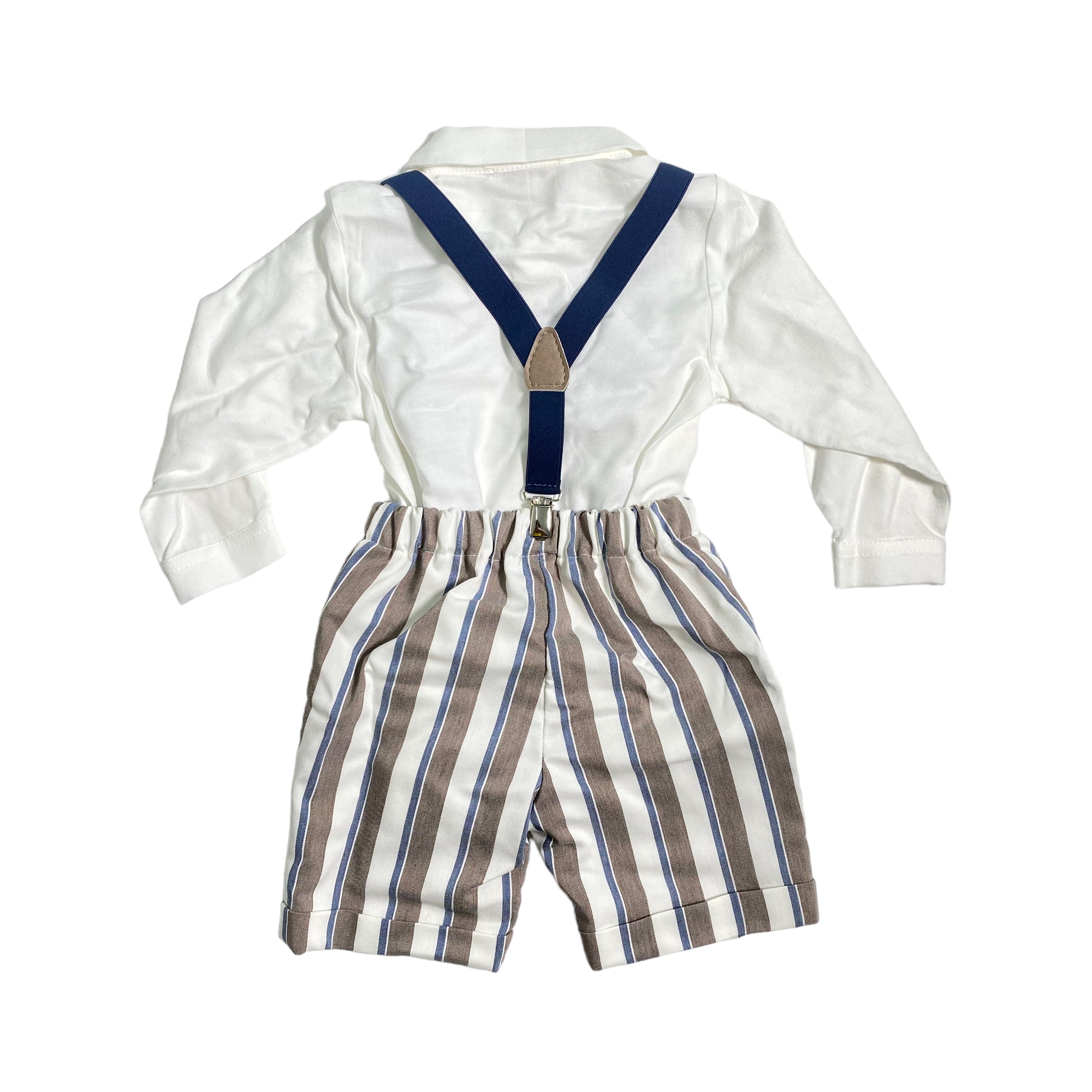 Warmer Baumwollanzug mit beige gestreiften Bermudashorts, cremefarbenem Body-Shirt, verstellbaren blauen elastischen Hosenträgern und Fliege aus dem gleichen Stoff wie die Hose.