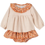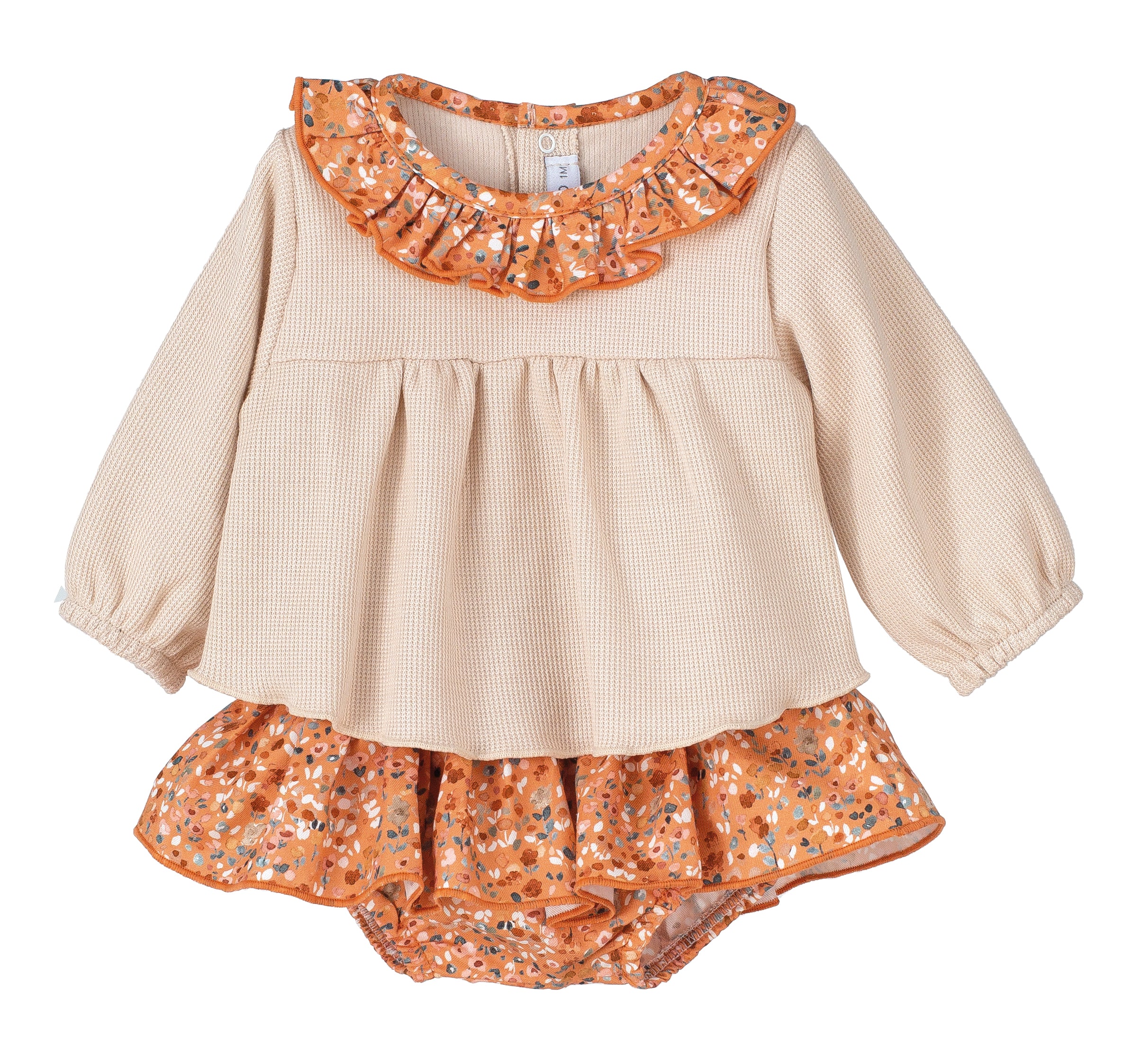 Warmes Baumwoll-Outfit bestehend aus einer Culotte mit Rockeffekt und Blumenmuster und einem beigen Pullover mit Rüschenkragen.
