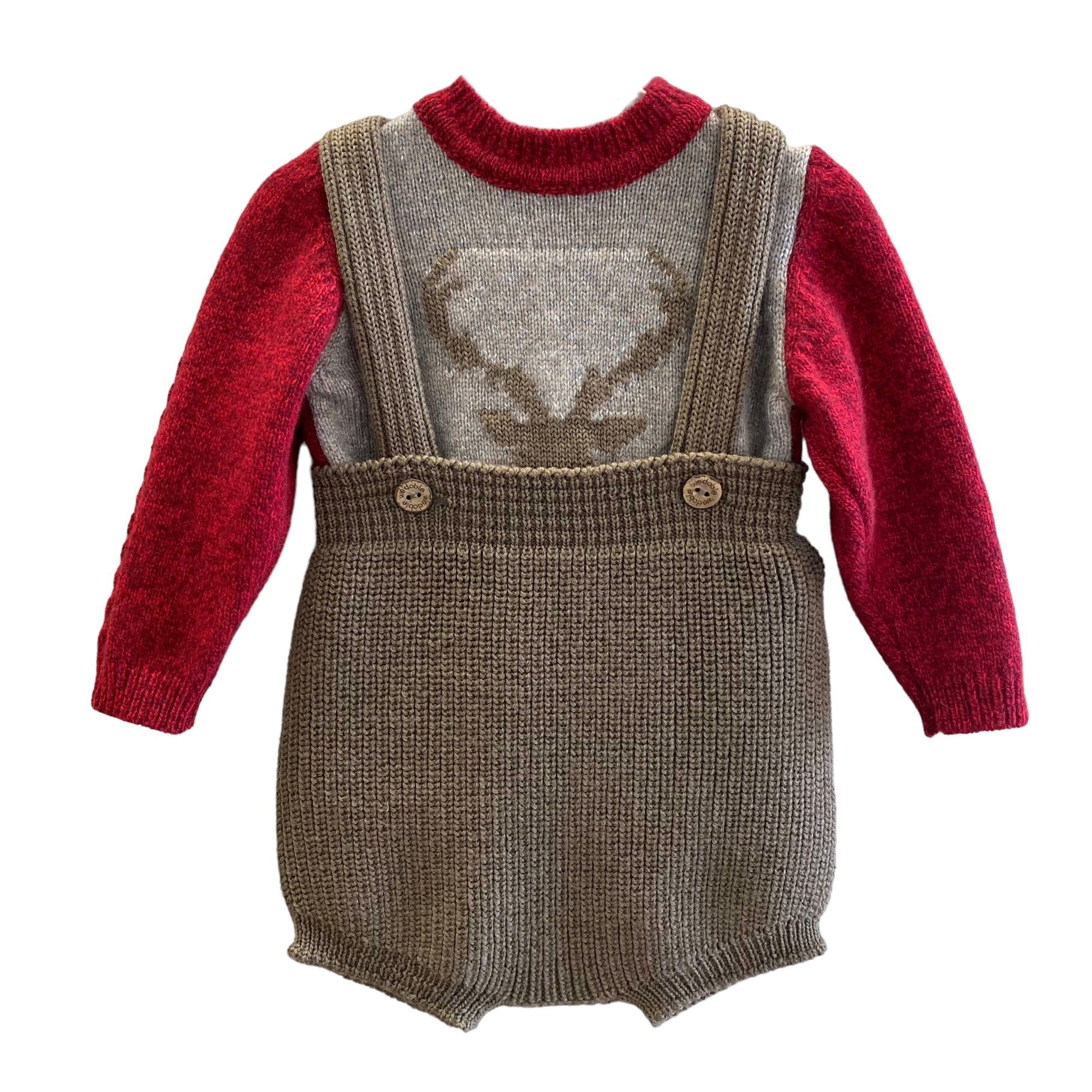 Wolloutfit mit Latzhose und Pullover mit Rentiermuster.