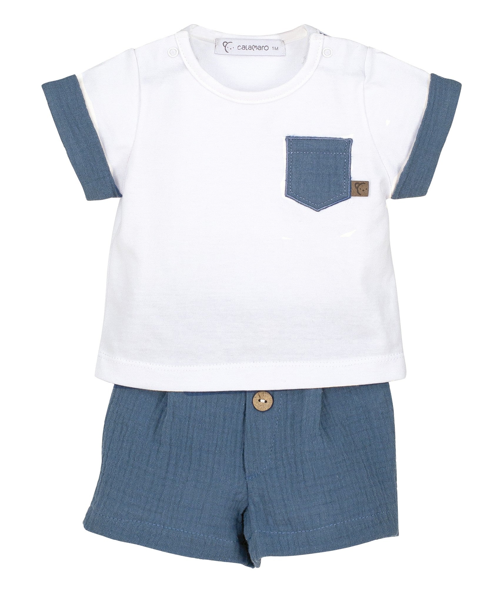- Bermudashorts aus blauer Gaze (Baumwolle).