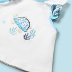 Maglietta con bretelle per neonata. Girocollo. Piccola apertura sulla schiena con chiusura con bottone per facilitare la vestibilità del capo. Design stampato.