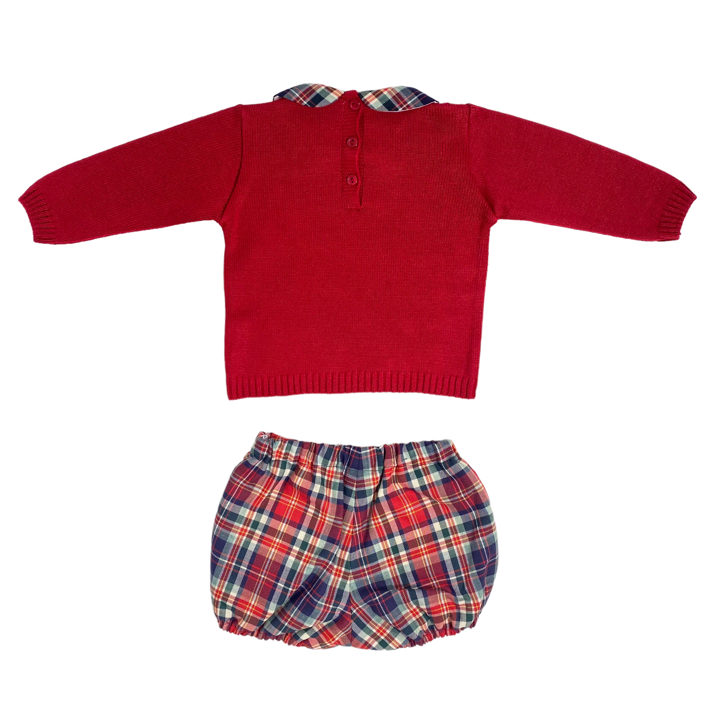 Warmer Baumwollanzug bestehend aus einer schottischen Bermudashorts und einem einfarbigen roten Pullover mit Kragen aus dem gleichen Stoff wie die Bermudashorts.