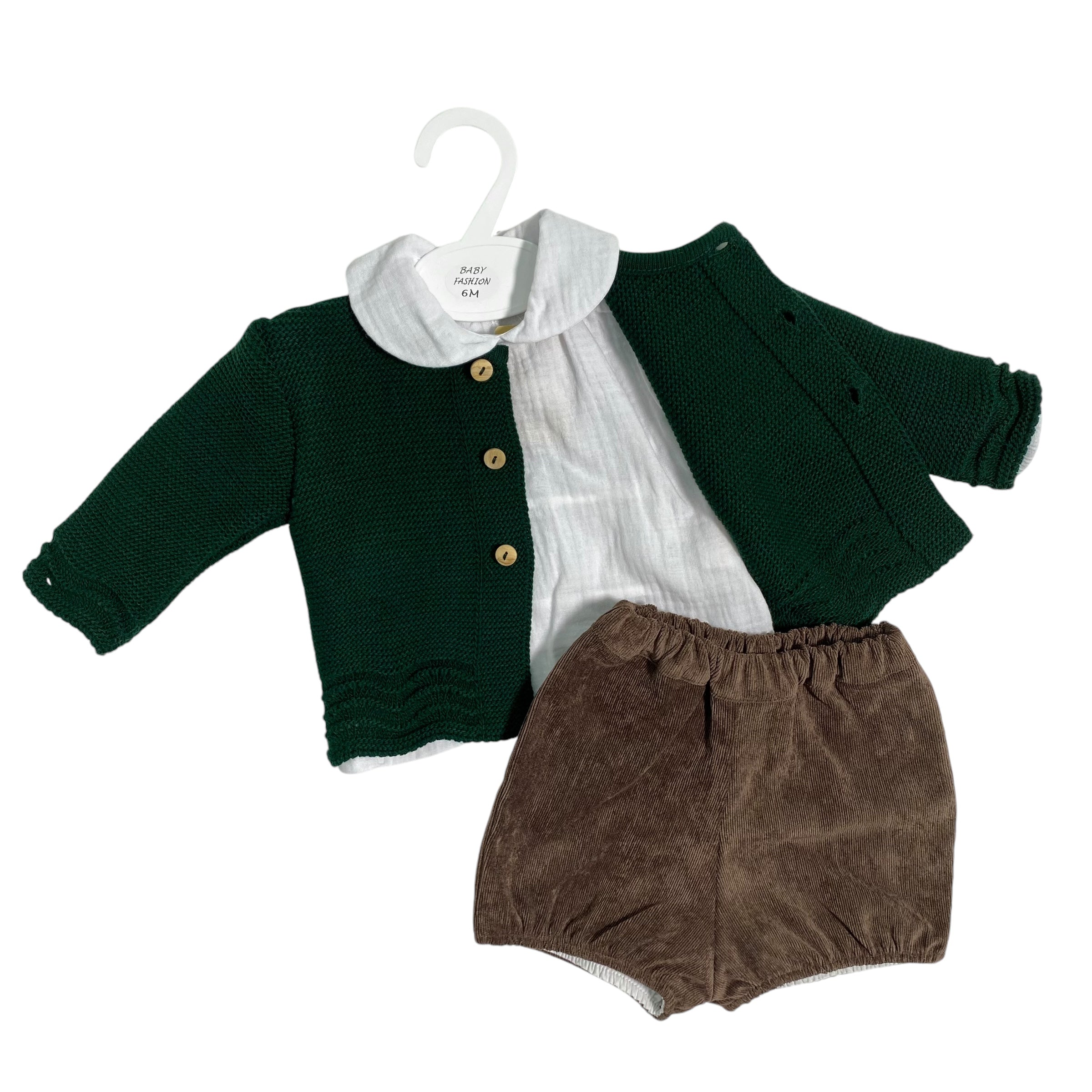 Esclusivo e alla moda, il completo tre pezzi BABY FASHION è perfetto per il tuo neonato/a. Con bermuda in morbido velluto millerighe, camicia bianca con collo tondo e cardigan in tessuto anallergico acrilico, il tuo bambino/a sarà sempre elegante e comodo per ogni occasione.
