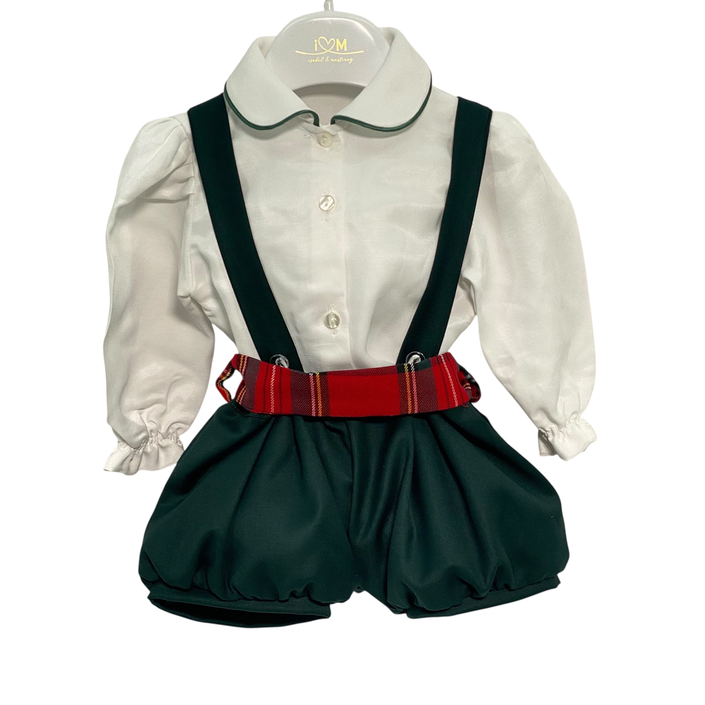 Completo elegante tre pezzi per neonata, con salopette a pagliaccio in cotone, camicia bianca in cotone con profilo verde e cintura scozzese. Perfetto per occasioni speciali, dona un tocco di eleganza alla tua bambina. Realizzato con materiali di qualità per il massimo comfort e stile.