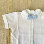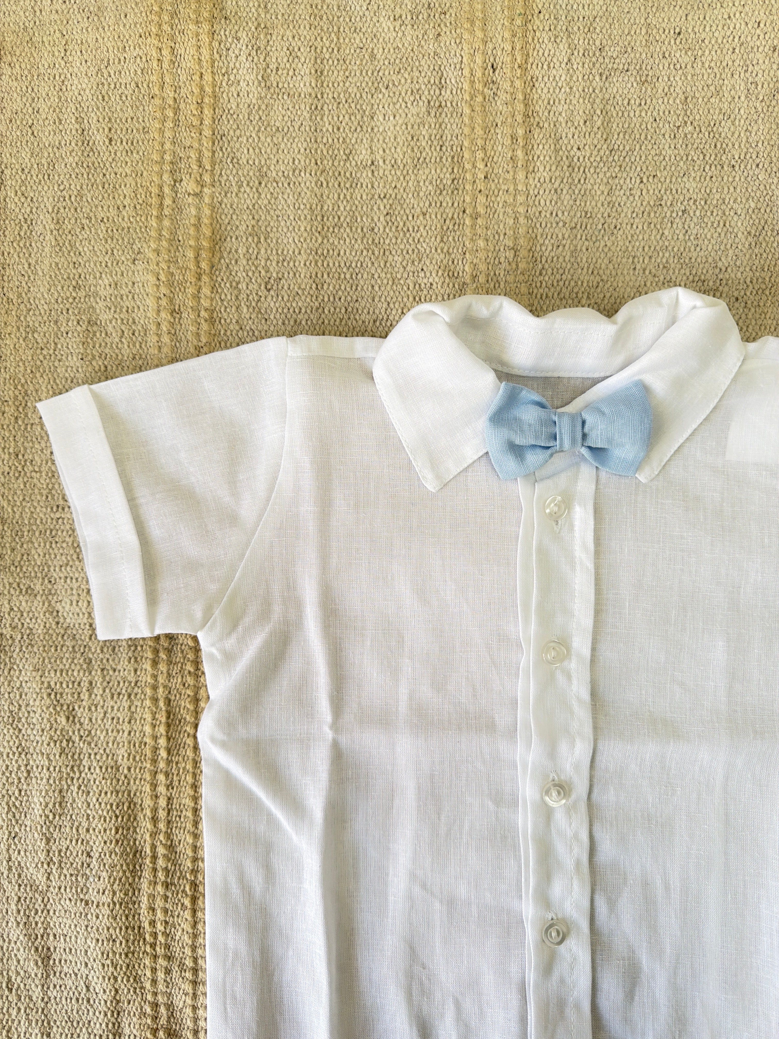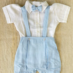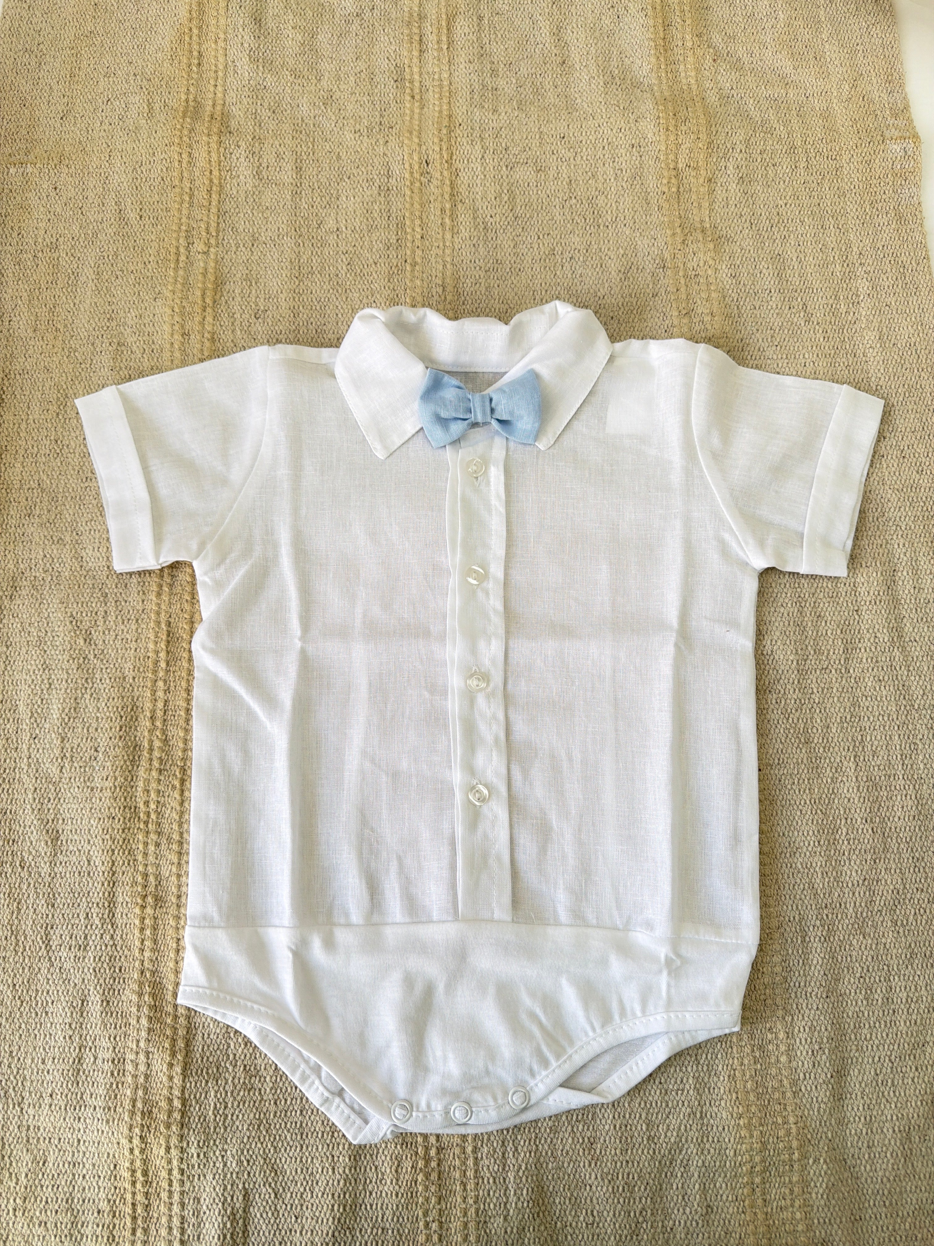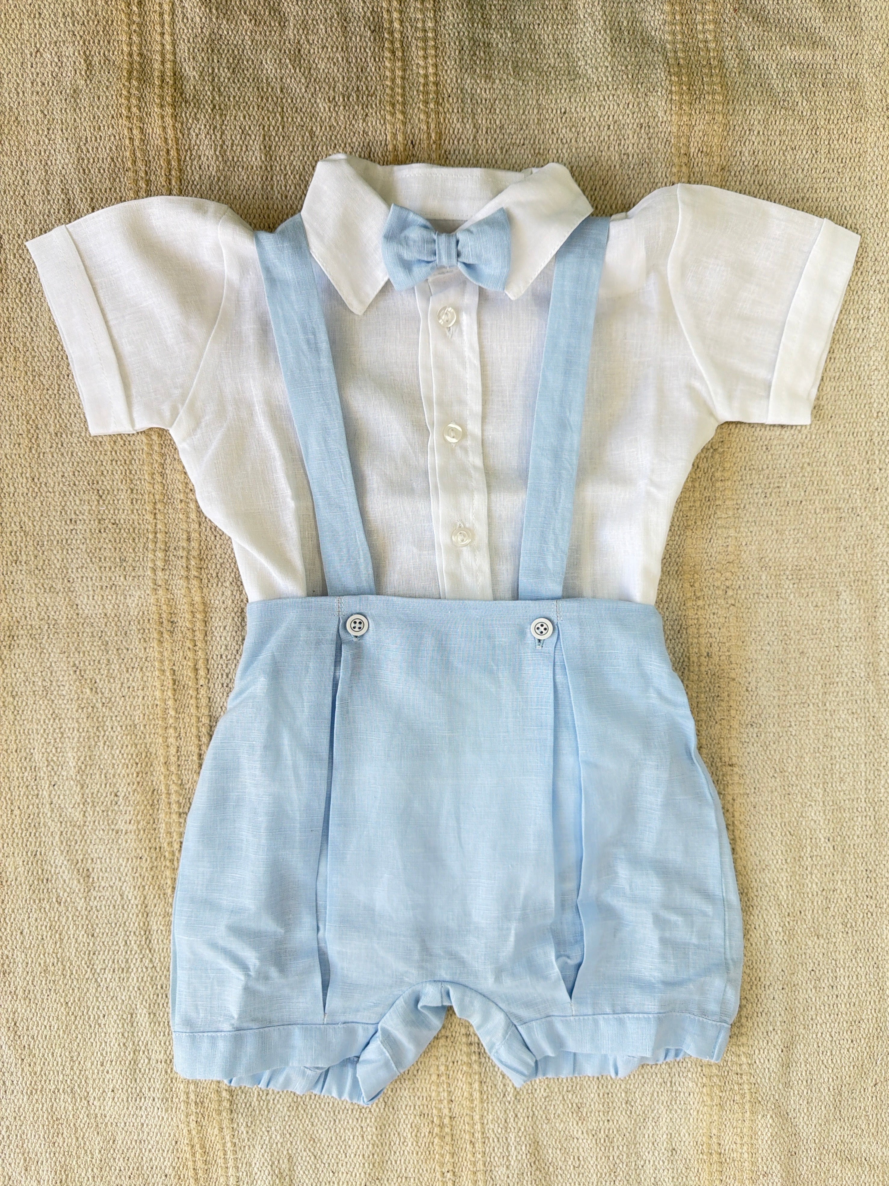 Completo elegante in misto lino per neonato composto da tre pezzi coordinati. Include una salopette con bretelle dal taglio classico, una camicia a mezza manica con papillon ricercato e un cardigan in filo leggero. Perfetto per occasioni speciali e momenti quotidiani, questo set combina stile sofisticato e comfort naturale. Il misto lino garantisce traspirabilità e morbidezza sulla pelle delicata del bambino. Una scelta raffinata per il guardaroba del vostro piccolo.