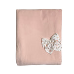 Gepolsterte Decke aus rosa Chenille mit floraler Stoffschleifenapplikation.