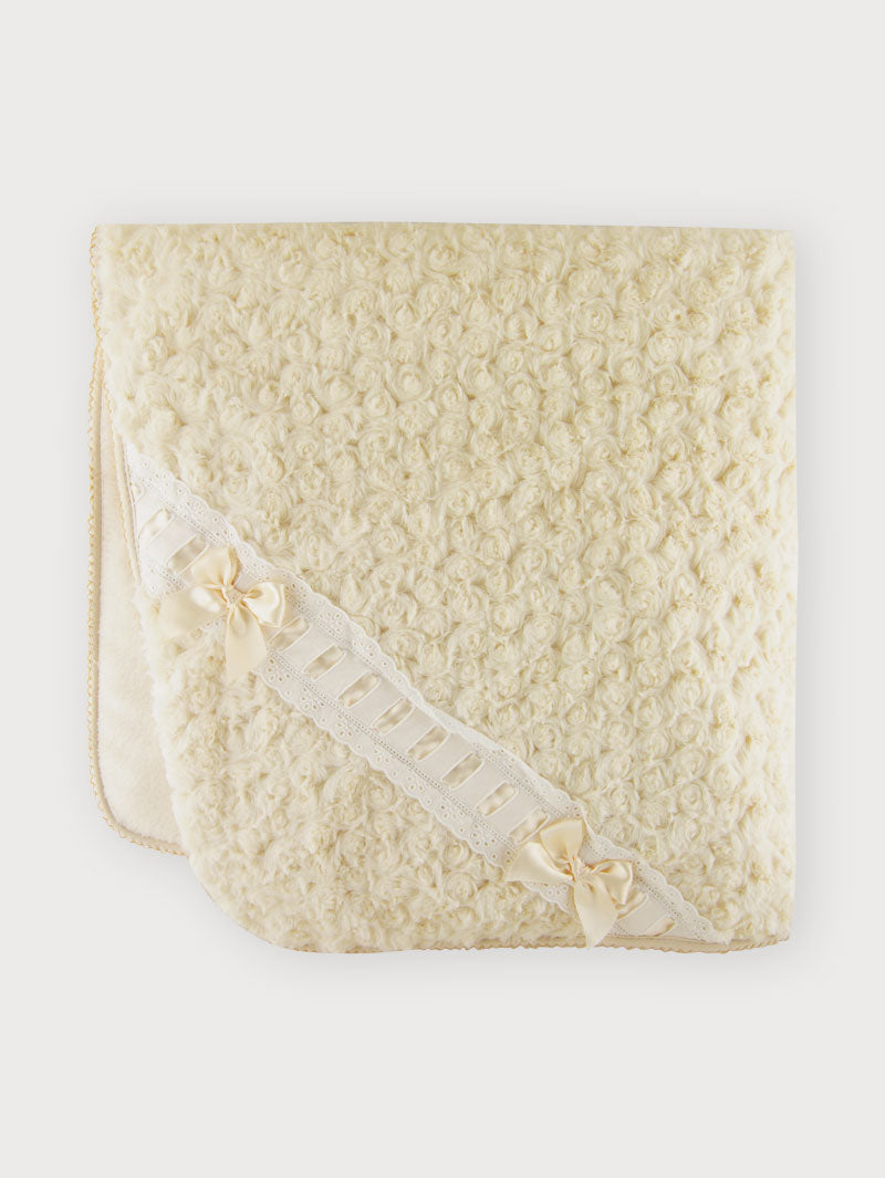 Sehr weiche Fleecedecke mit Kunstpelzoberteil, verziert mit Spitze und Bändern.