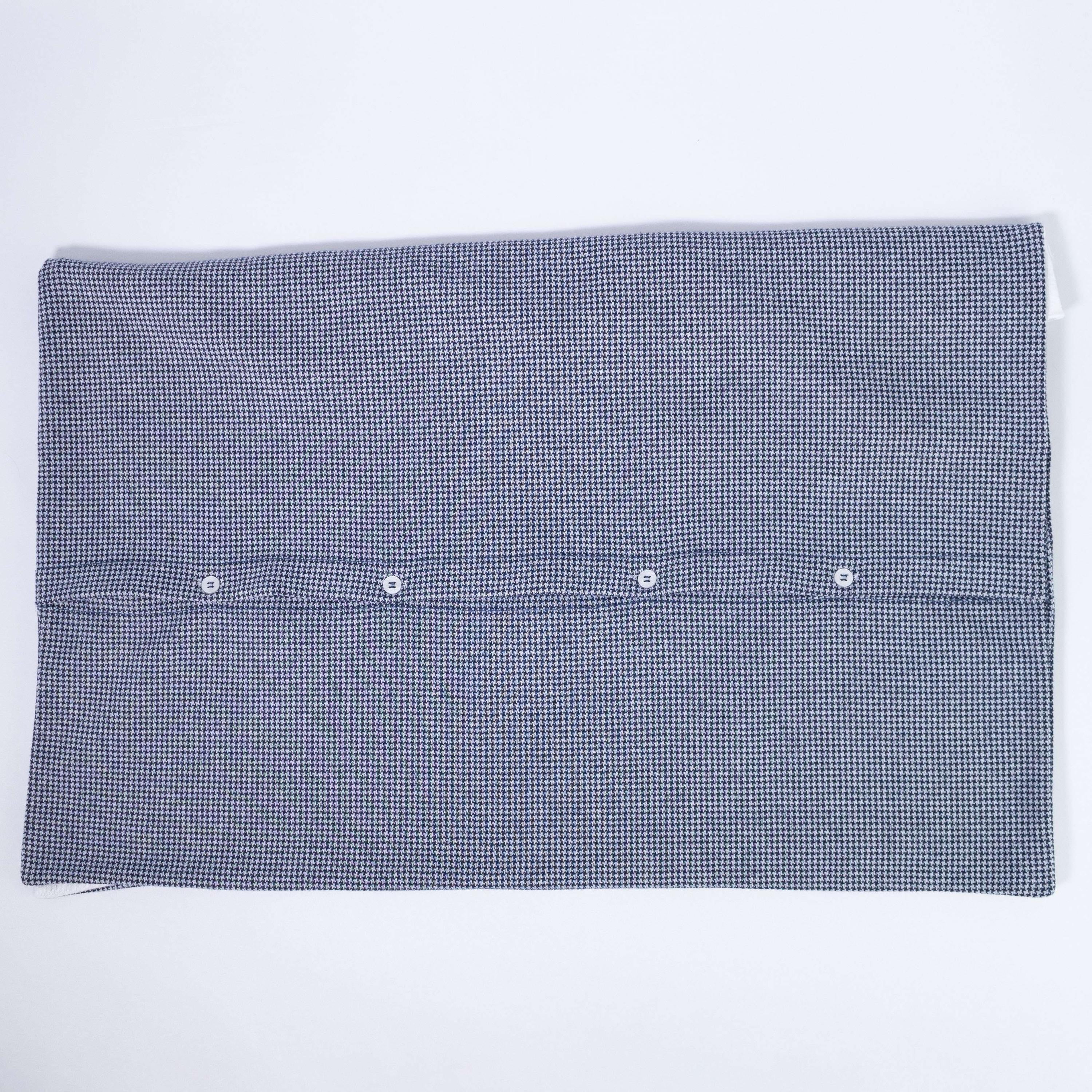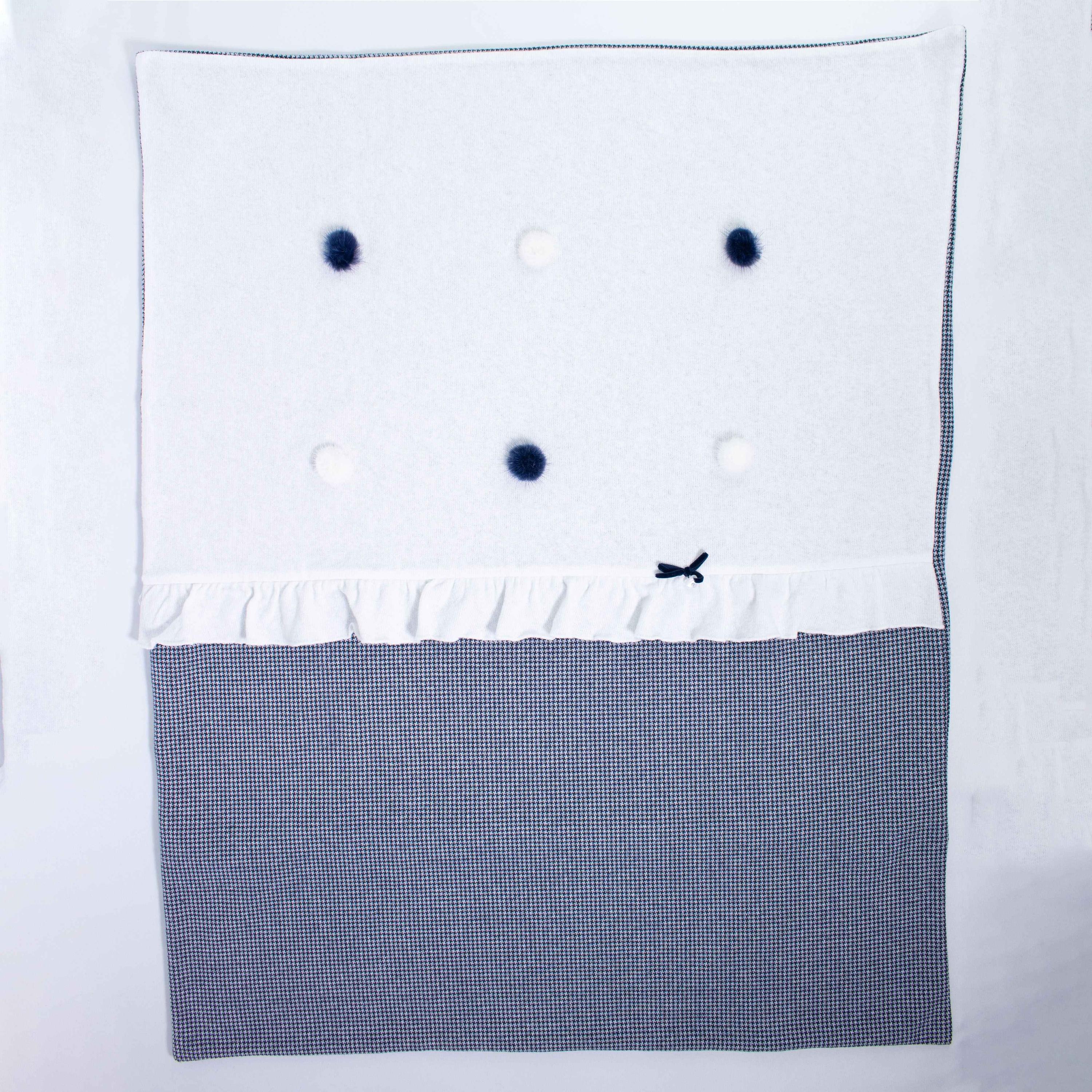 Gefütterte Decke, abnehmbar und vielseitig, kann auch als bequemes Tuch aus warmer Baumwolle und Wolle verwendet werden. Der weiße Teil ist aus Wolle, angereichert mit Pelzpompons in Creme und blauem Kontrast.
