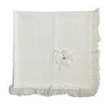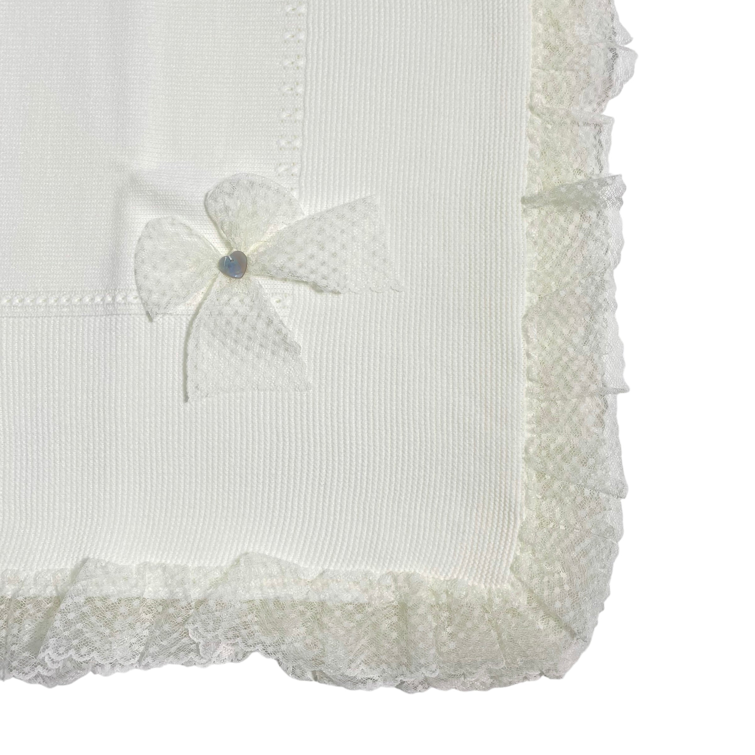 Coperta scialle in morbido acrilico anallergico con balza in pizzo, perfetta per coccolare la tua neonata con eleganza e sicurezza. Ideale per l'uscita clinica, ti offre un comfort delicato e senza paragoni grazie alla sua composizione e alla cura dei dettagli.