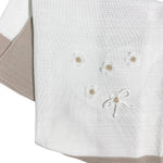 Schaldecke aus Baumwollgarn, weiß mit beigen Bändern und zentraler Herzstickerei.