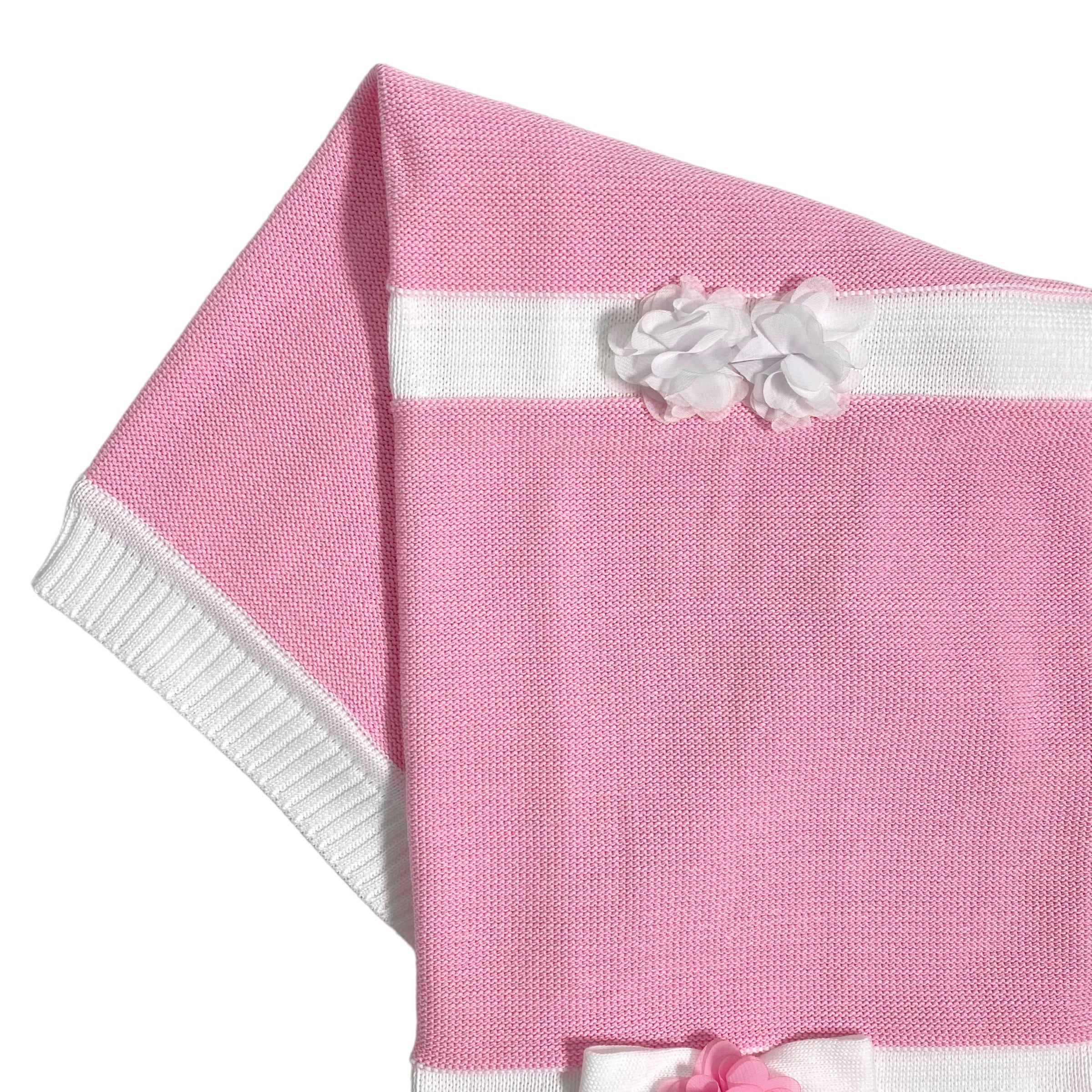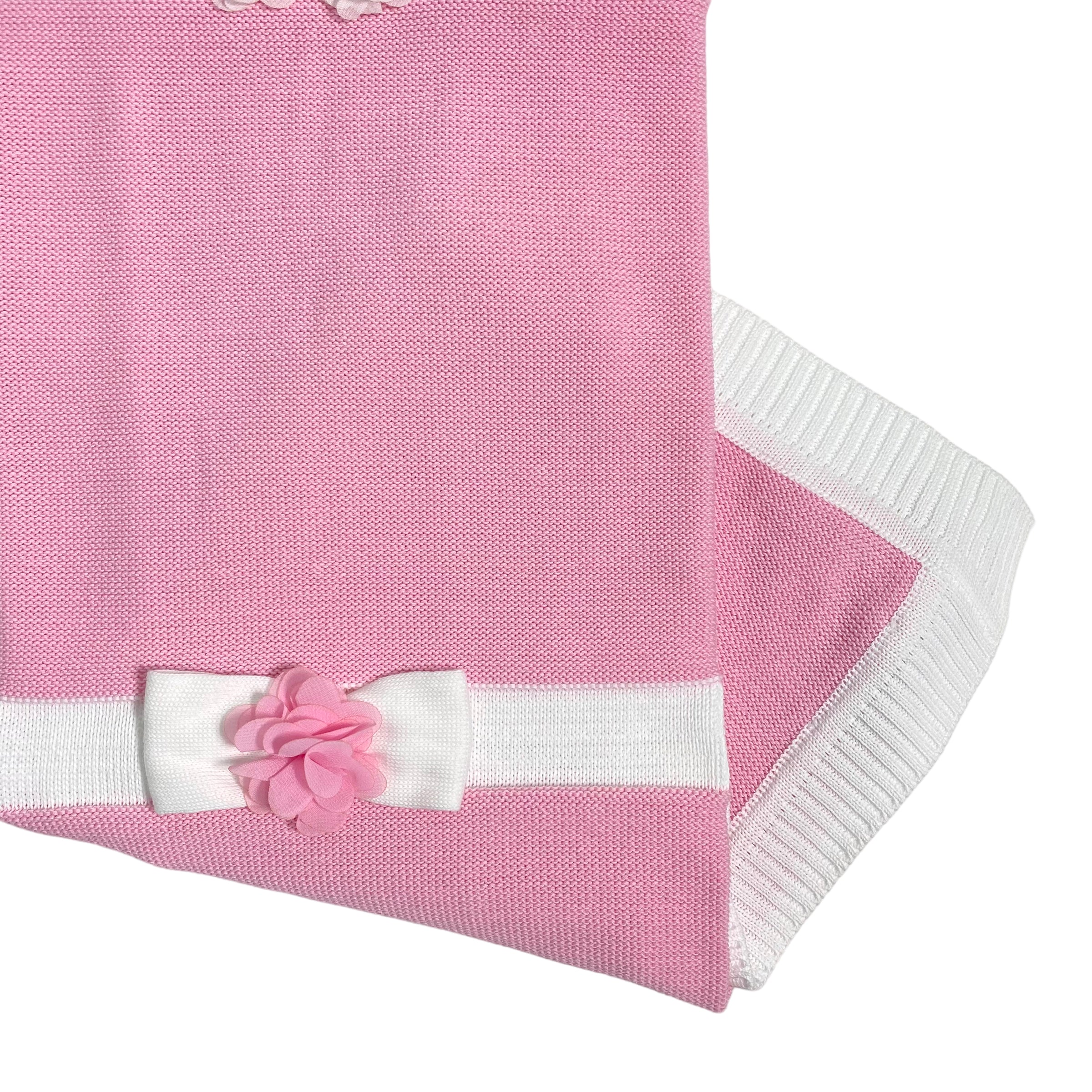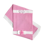Schaldecke aus Baumwollgarn, rosa, mit weißen Bändern und Applikation aus Schleife und Blütenblättern.