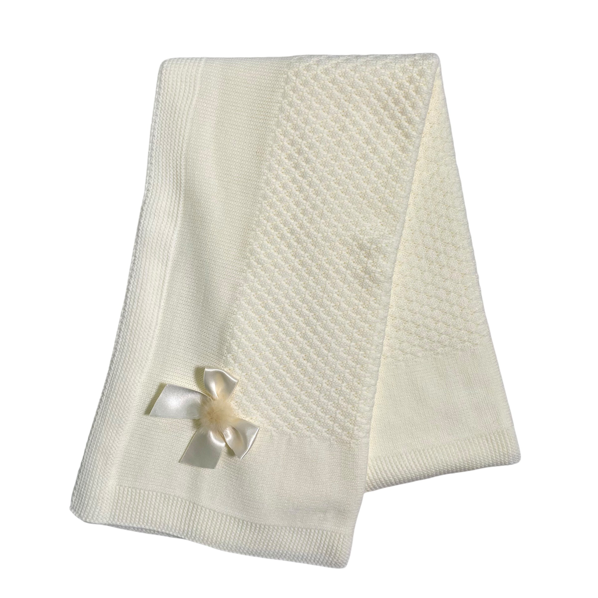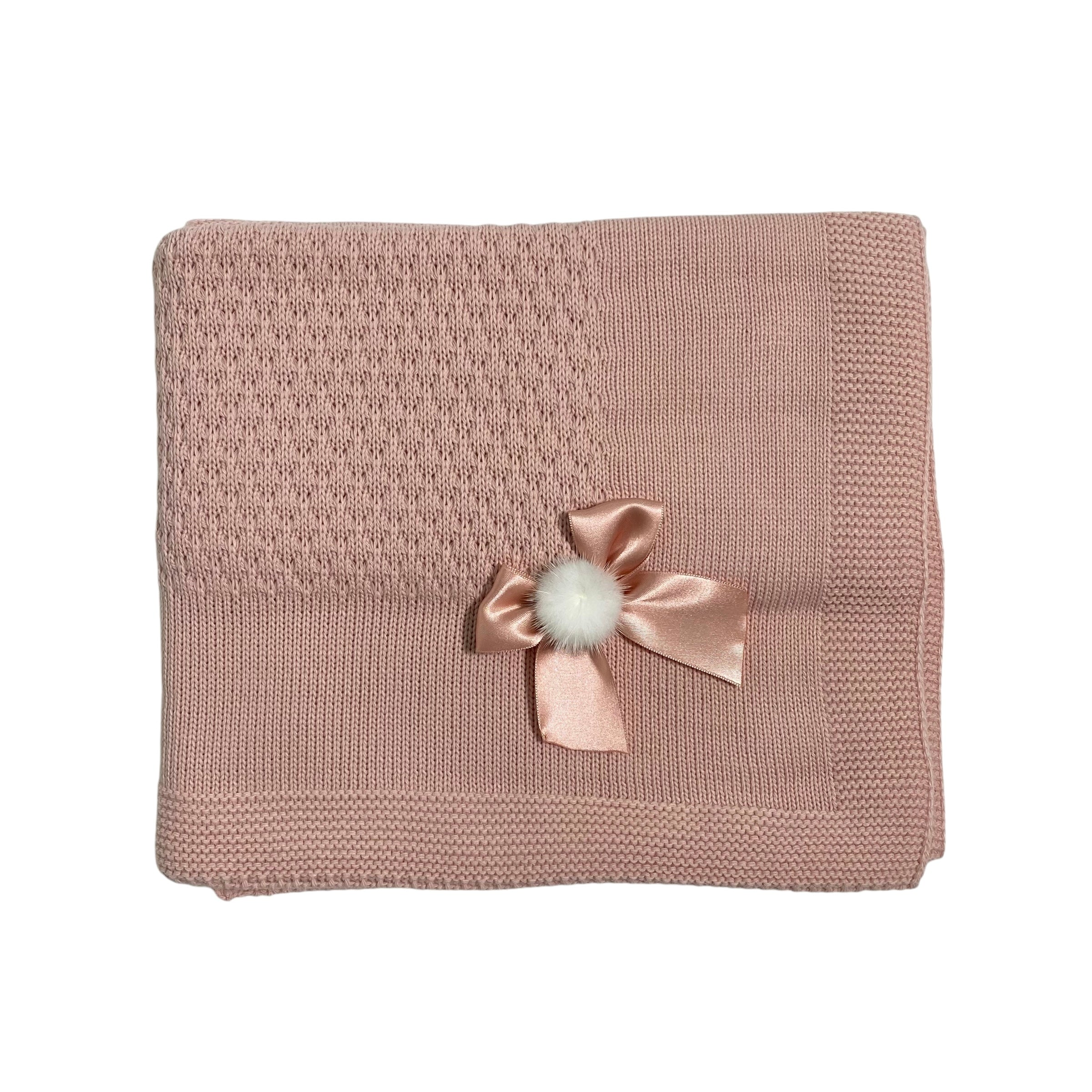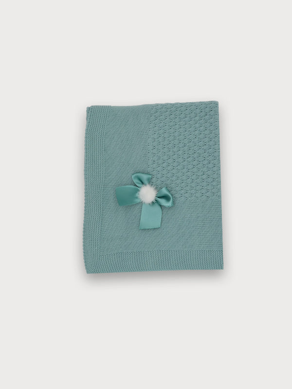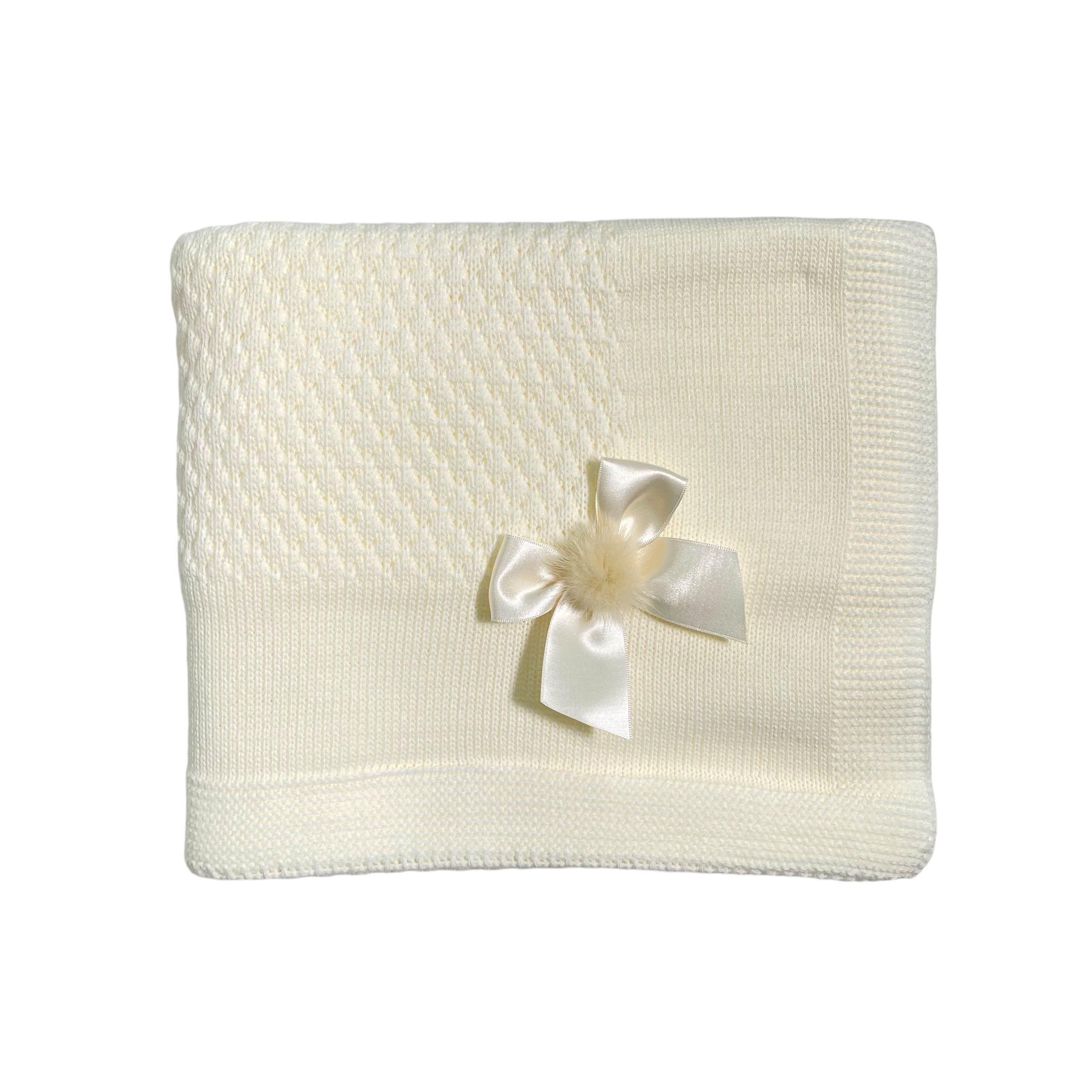Questa coperta scialle in tessuto anallergico è perfetta per la tua neonata. Con la sua trama particolare e il fiocco in raso con pom pon, è un'opzione calda, morbida e elegante. Fatta in tessuto acrilico, è l'ideale per proteggere la pelle delicata del tuo bambino e mantenerlo al caldo con stile.