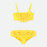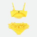 Favoloso bikini giallo con volant per bambine. Top e slip presentano voluminosi volant in morbido tulle con brillantini dorati. Costume da bagno completamente foderato e realizzato in tessuto SPF 50 per una protezione solare ottimale.
