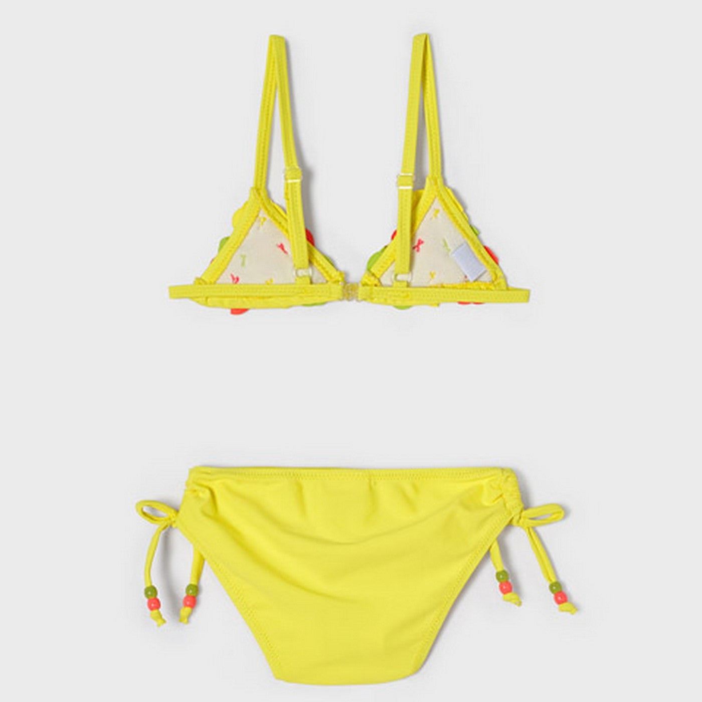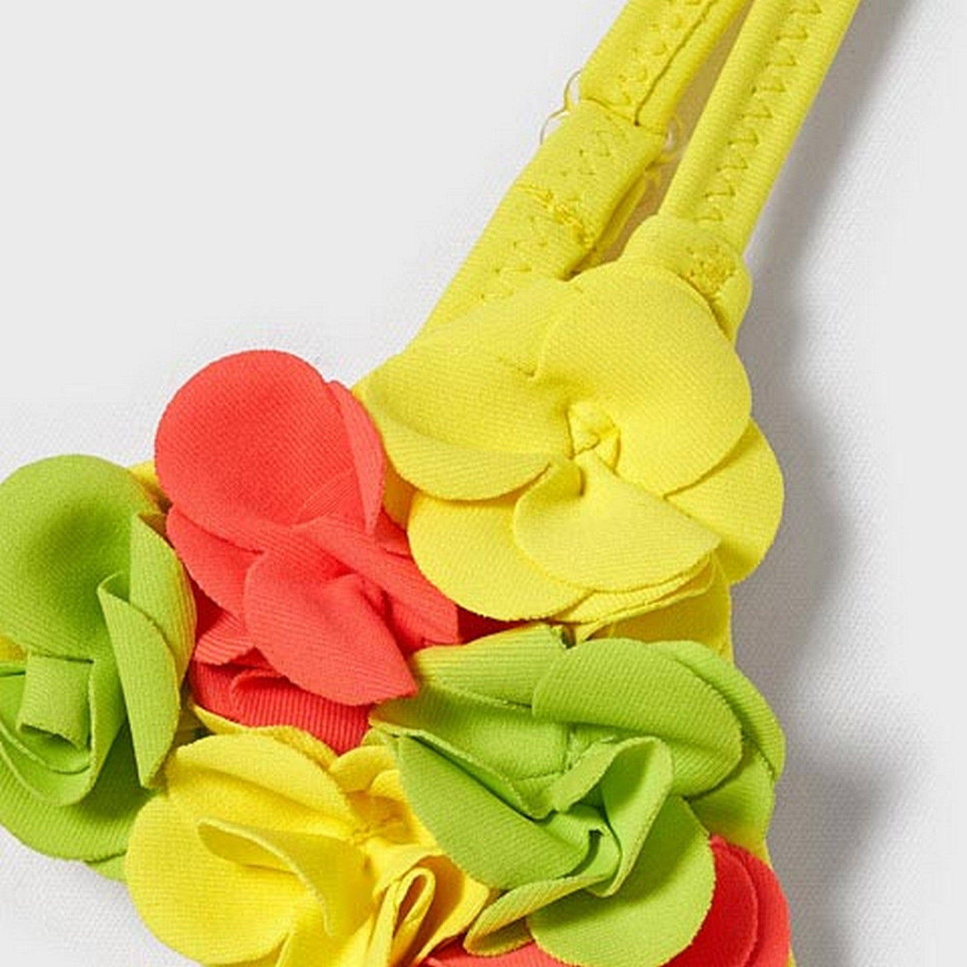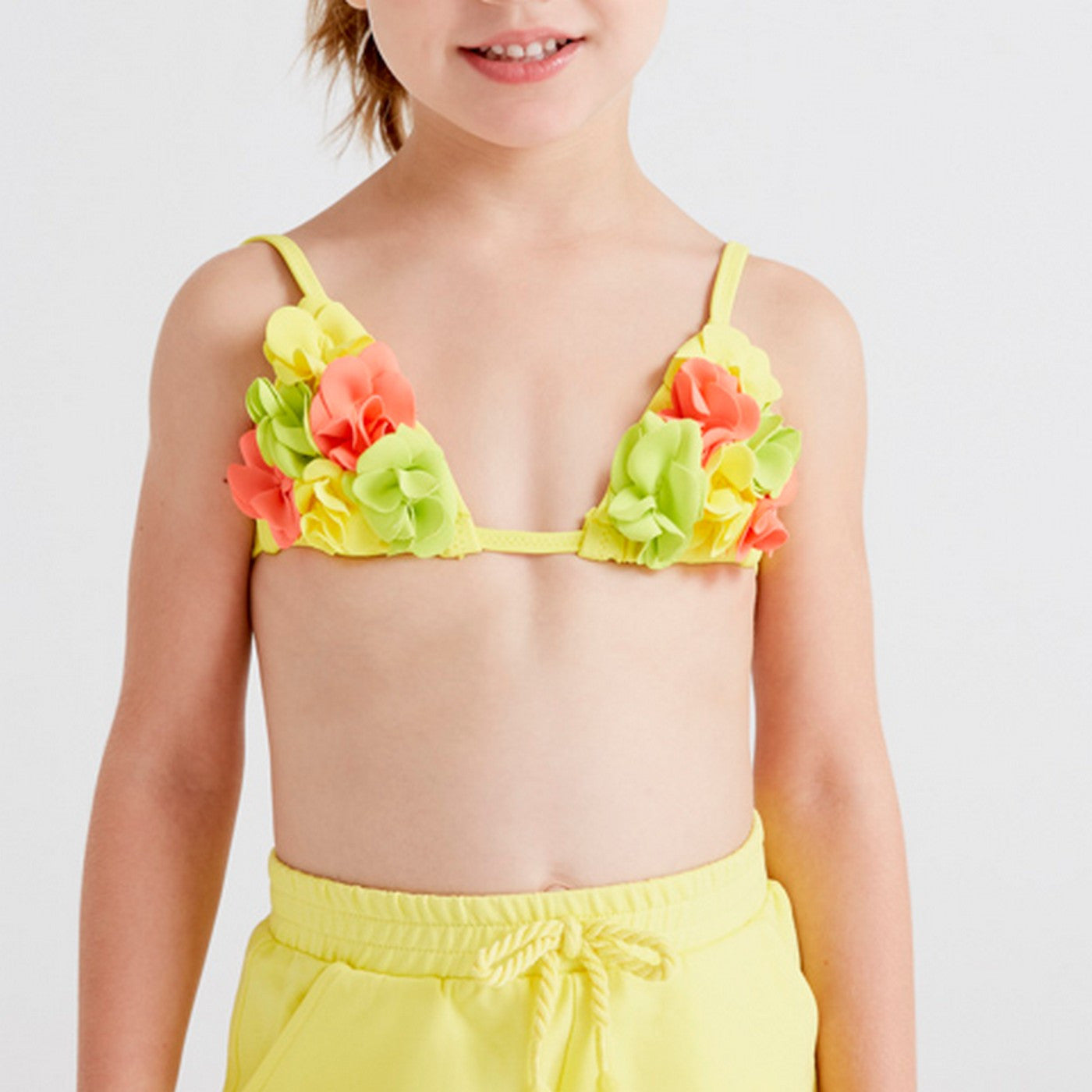 Das Bikinioberteil ist auf der Vorderseite mit bunten Blumen verziert.