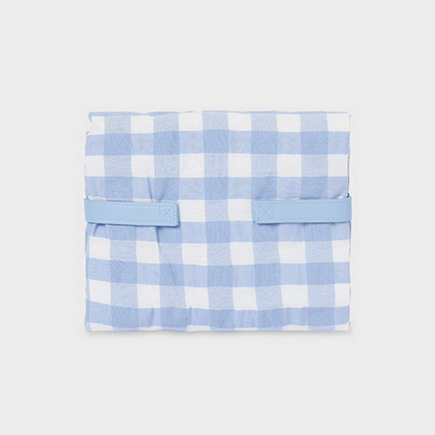 Tragbarer Wickeltisch aus kariertem Stoff.